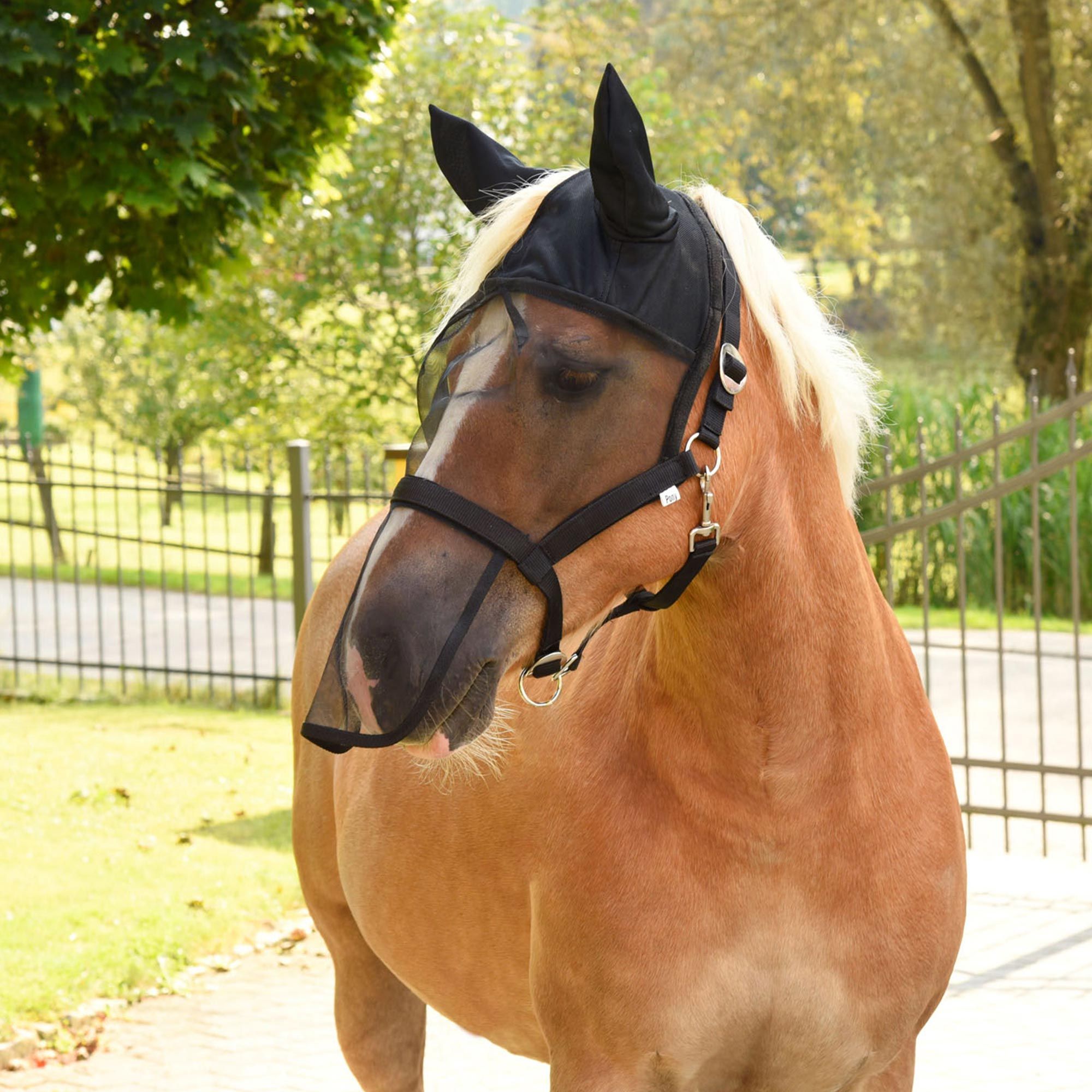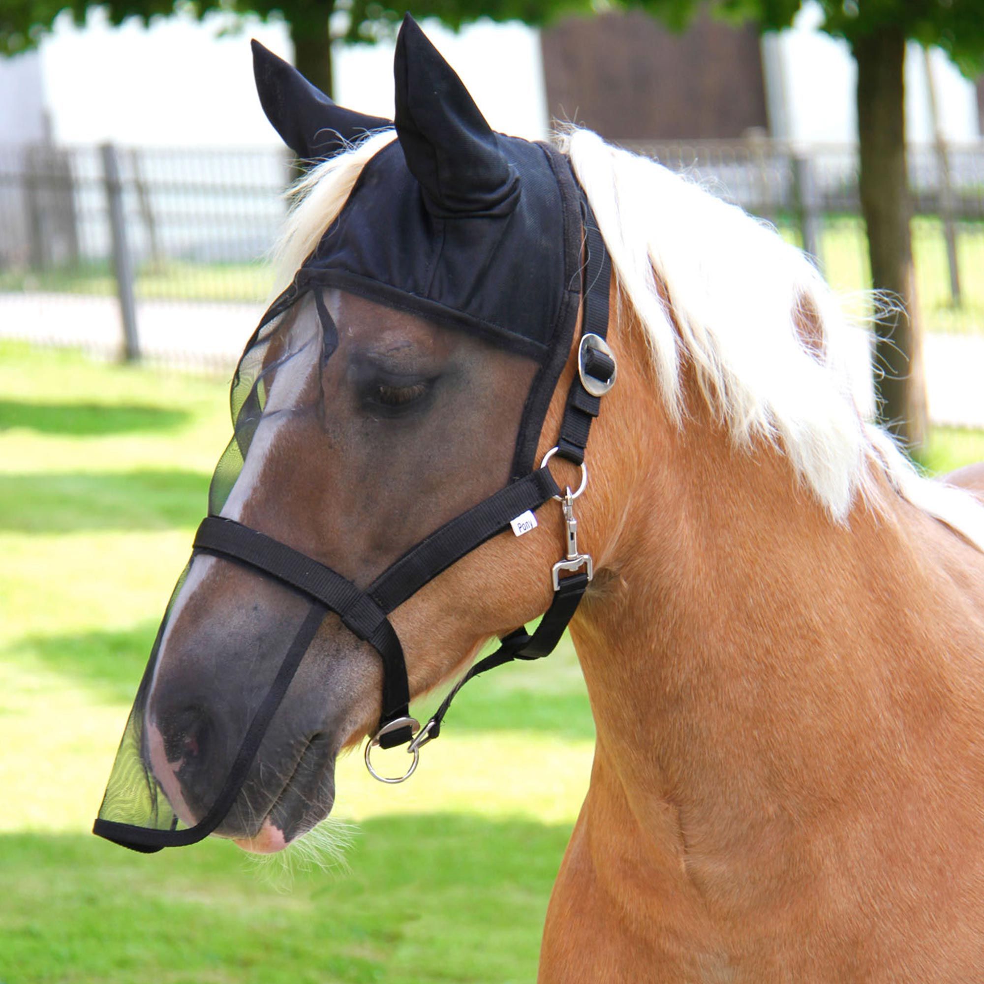 Durch den integrierten Halfter ist ein Verrutschen oder Verlieren der Fliegenschutzmaske nicht mehr möglich