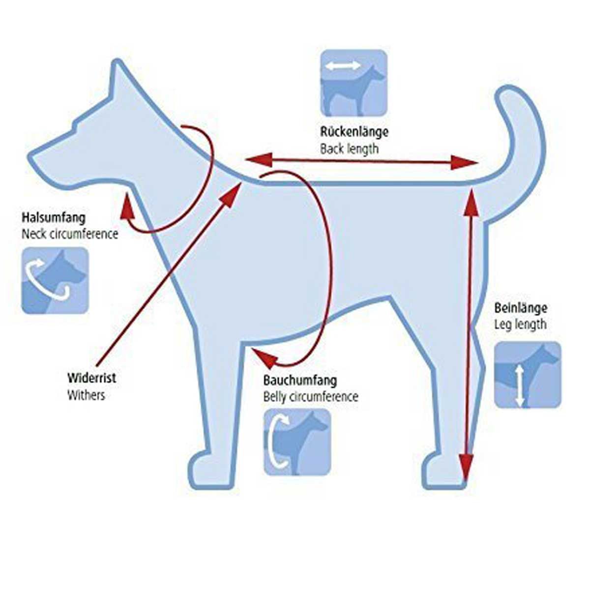 Der Bauchumfang des Bekleidungsstücks sollte deshalb 5 - 10 cm größer sein als der ihres Hundes, um ausreichend Bewegungsfreiheit zu gewähren.