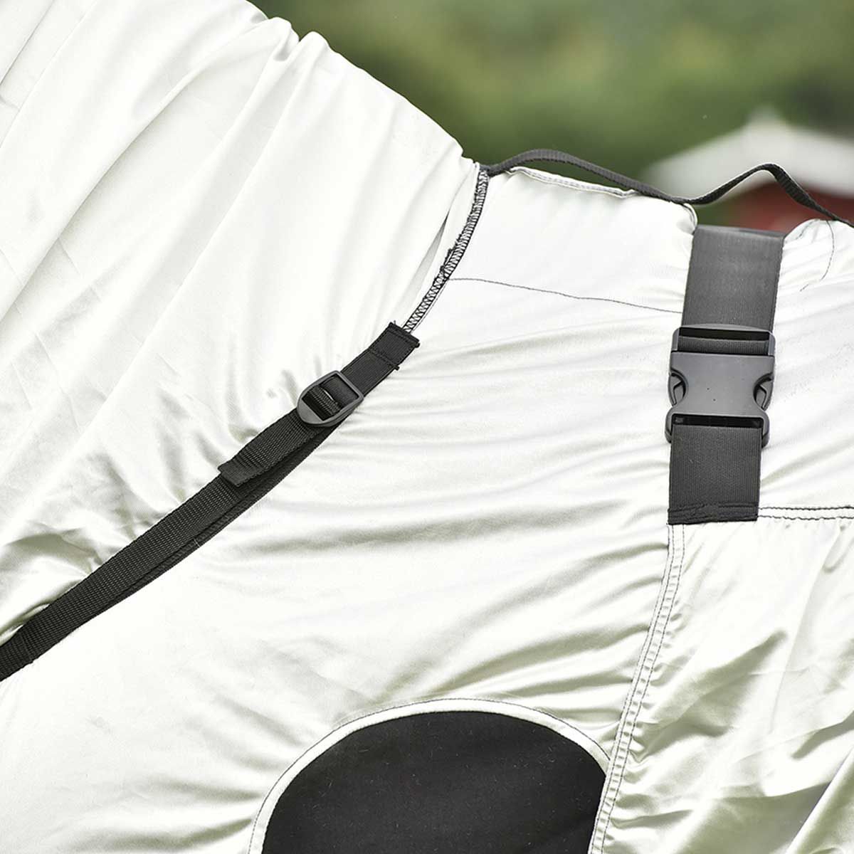 Für die endgültige Anpassung einer Pferdedecke sollten die Einstellmöglichkeiten am Produkt genutzt werden, da falsches Anlegen zu Schäden führen kann. Selbst bei optimaler Anpassung ist eine regelmäßige Kontrolle der Passform unerlässlich. Überprüfe, ob die Decke korrekt sitzt, die Klettverschlüsse sauber sind (um Scheuerstellen zu vermeiden) und die Decke intakt ist.