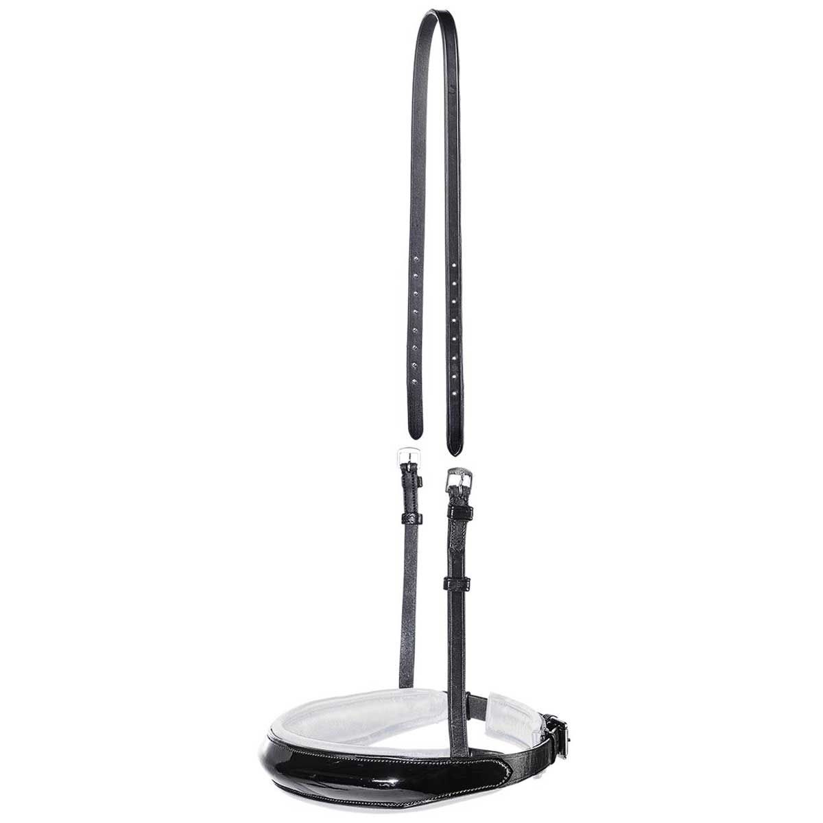 - Englisches Reithalfter mit seitlich sich verjüngendem sowie extra breitem, weich gepolstertem Nasenriemen mit Lackleder-Oberfläche, Rollschnalle und integriertem Kieferpad