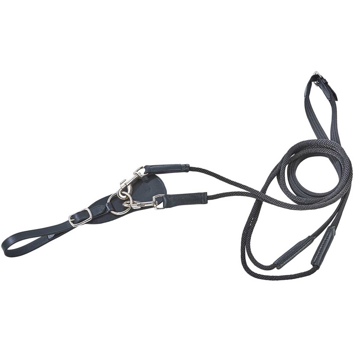 Teilbare Gurtschlaufzügel mit 150 cm langer Rundkordel für wenig Reibungswiderstand beim Durchgleiten, einzuhaken mit Drehkarabinerhaken in die zu öffnende Sattelgurtlederschlaufe.