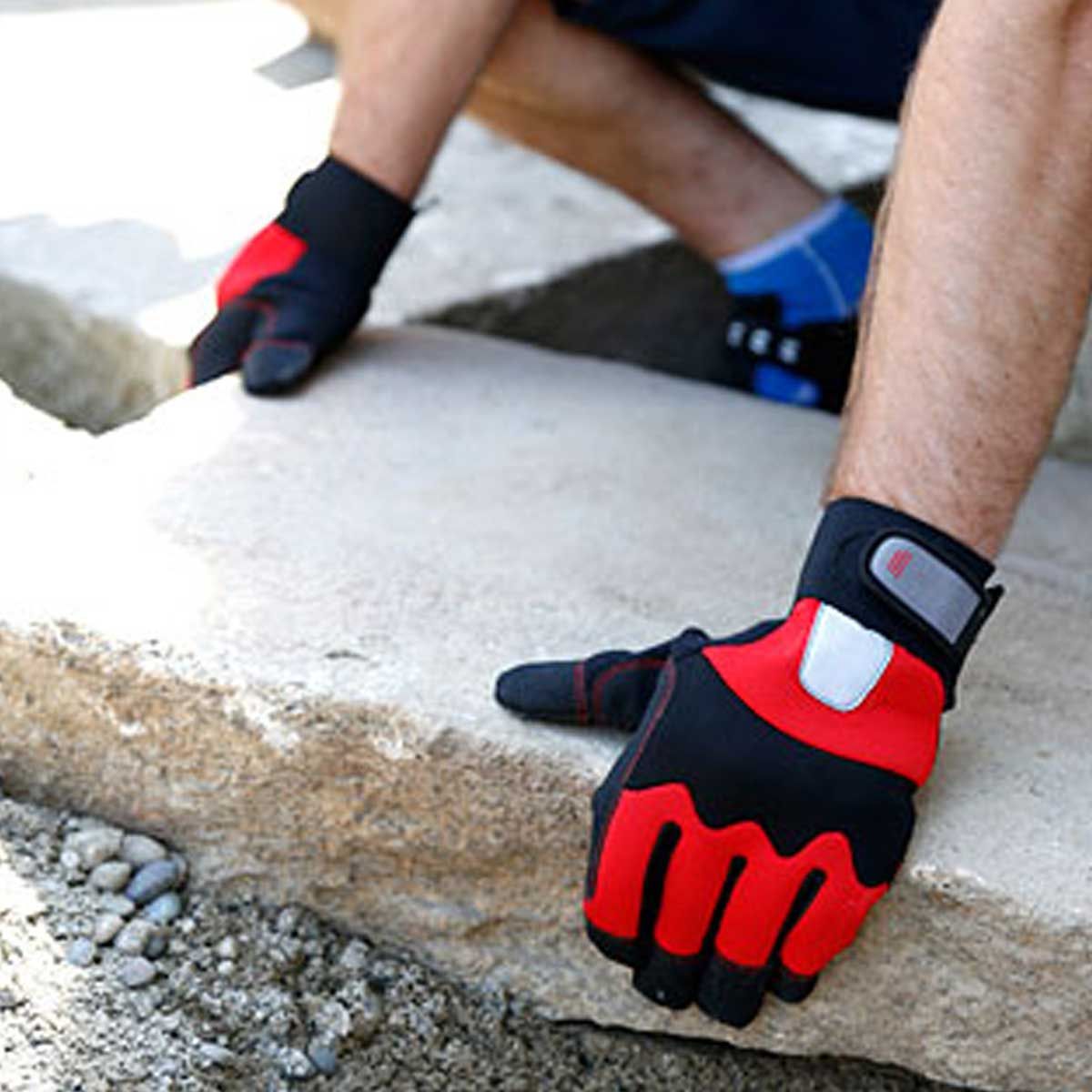 Der Handschuh sorgt mit Vibrationsdämpfernan der Handfläche für ermüdungsfreies Arbeiten. Die mit PVC doppelt verstärkten, angerauten Hand- und Fingerflächen bieten hervorragende Haltbarkeit und Griff und sind auch zum Arbeiten mit Seilen geeignet. Der verstärkte Daumen-Zeigefingerbereich sorgt für eine längere Nutzungsdauer und durch den elastischen Spandex am Handrücken werden für perfekte Passform und Luftdurchlässigkeit garantiert. Der Klettverschluss am Handgelenk schützt gegen Hineinfallen von Fremdkörpern. Besonderen Schutz bietet der Finderknöchelschutz aus Neopren.