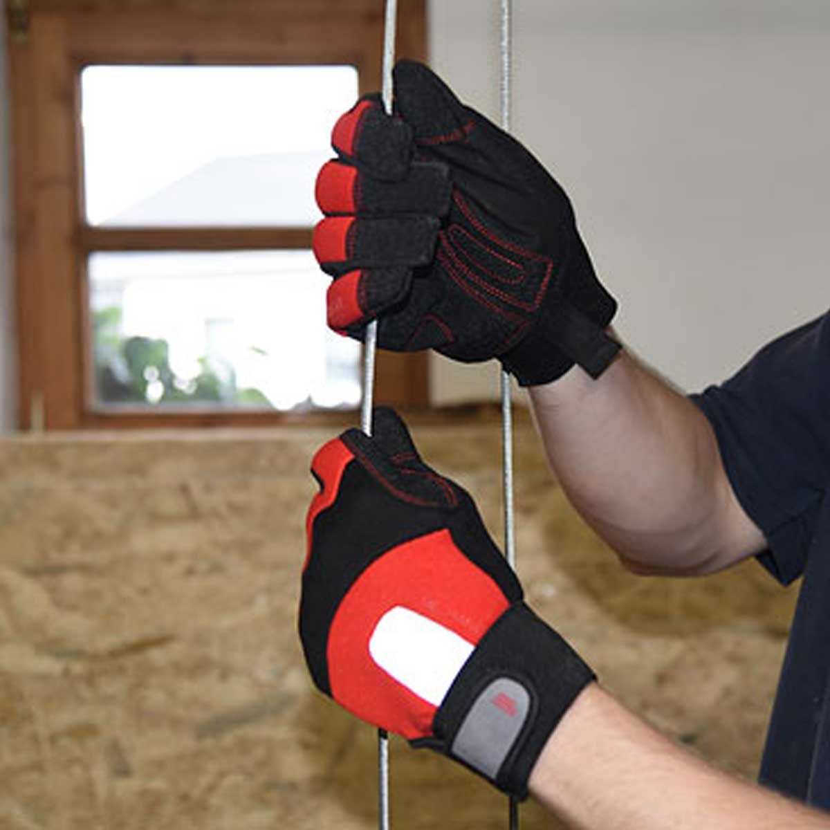 - Mit PVC doppelt verstärkte, angeraute Hand- und Fingerflächen für hervorragende Haltbarkeit und Griff, auch zum Arbeiten mit Seilen geeignet