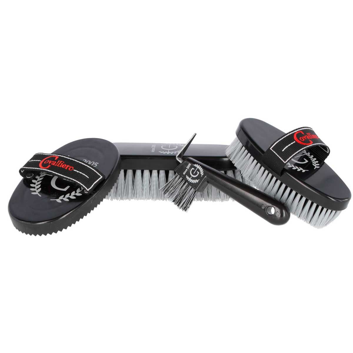 Kunststoffstriegel, Mähnenbürste, Pferdekardätsche und Hufkratzer