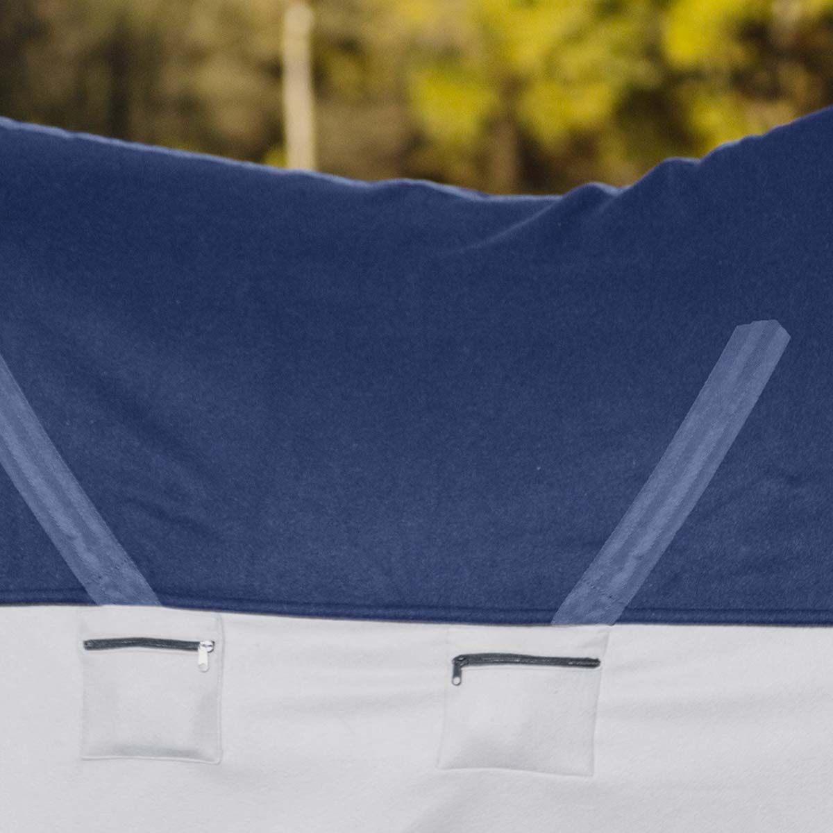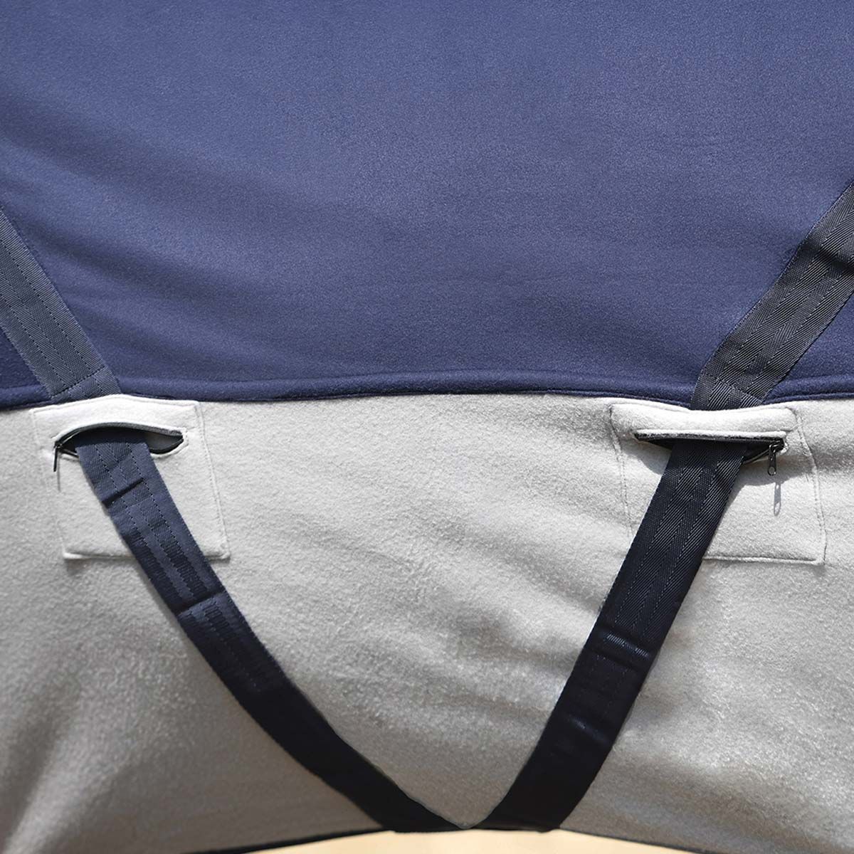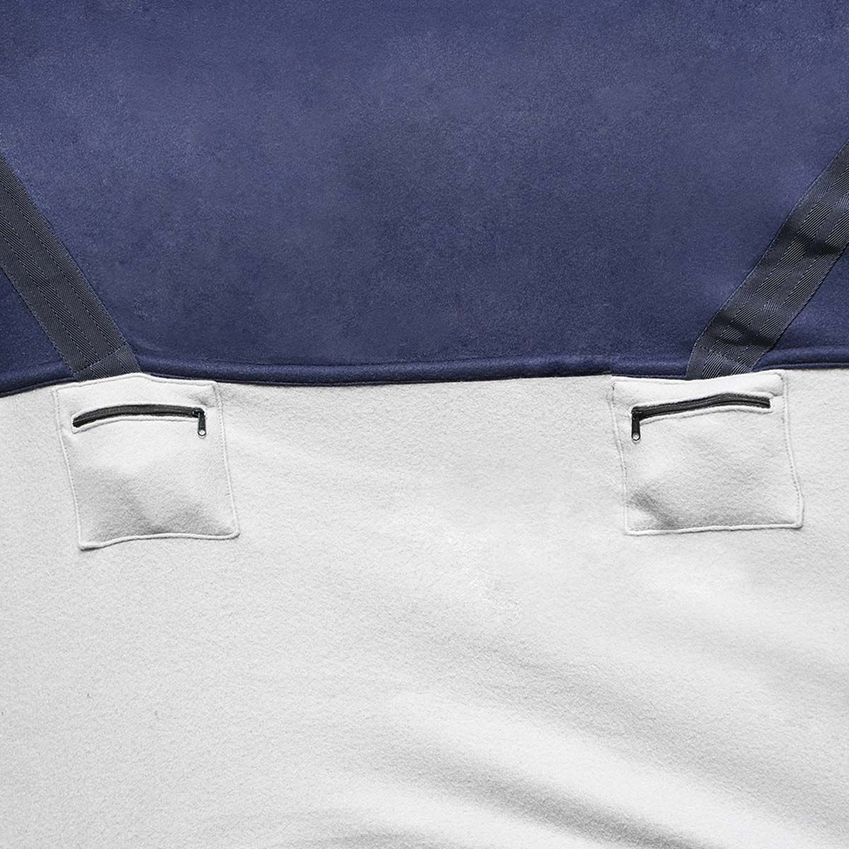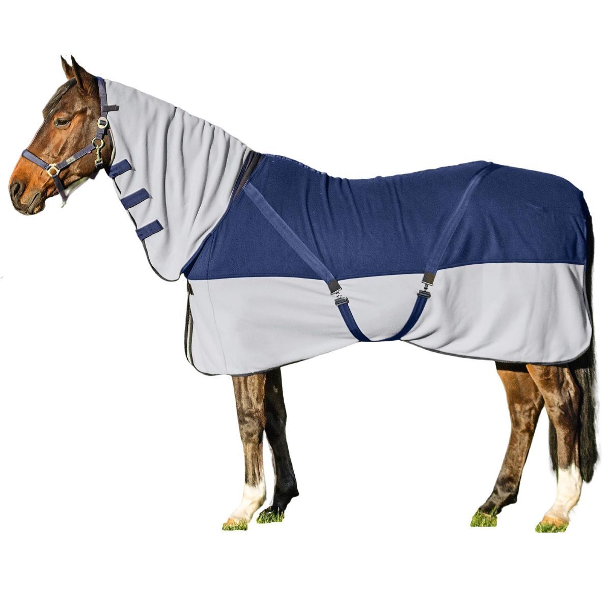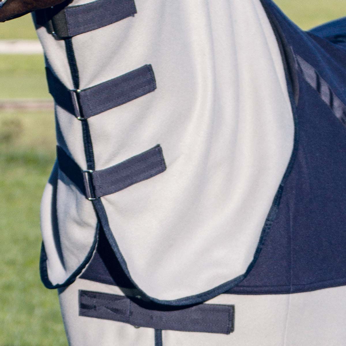 Großzügig geschnittene Abschwitzdecke mit Halsteil und Spezialkreuzgurten für Stall und Transport.