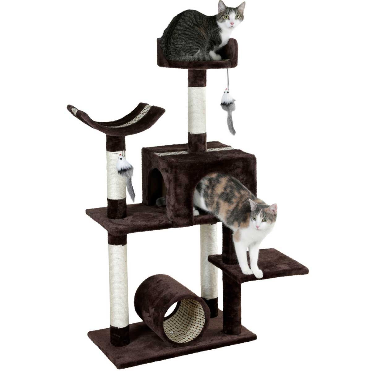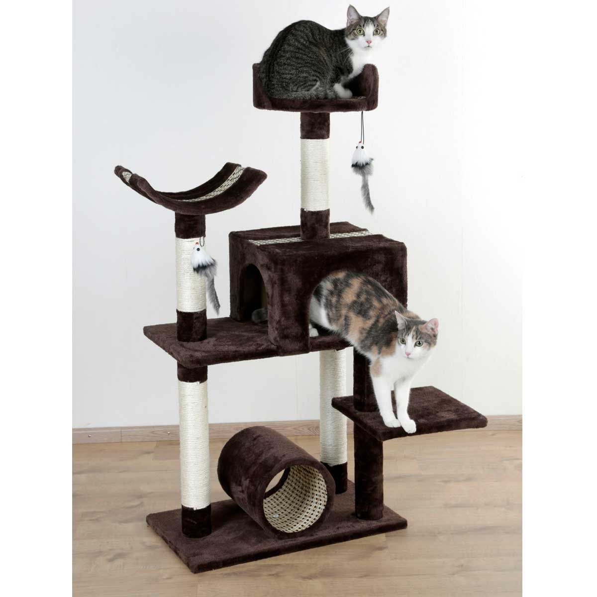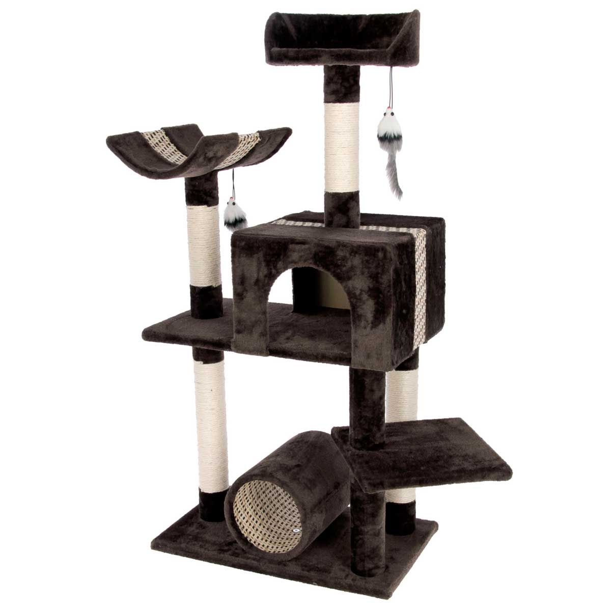Der Kratzbaum ist mit Liegebett, Liegemulde, Tunnel und Höhle ausgestattet. Der Baum verfügt auc hüber eine extra starke Bodenplatte. Sisal an den Säulen verklebt.