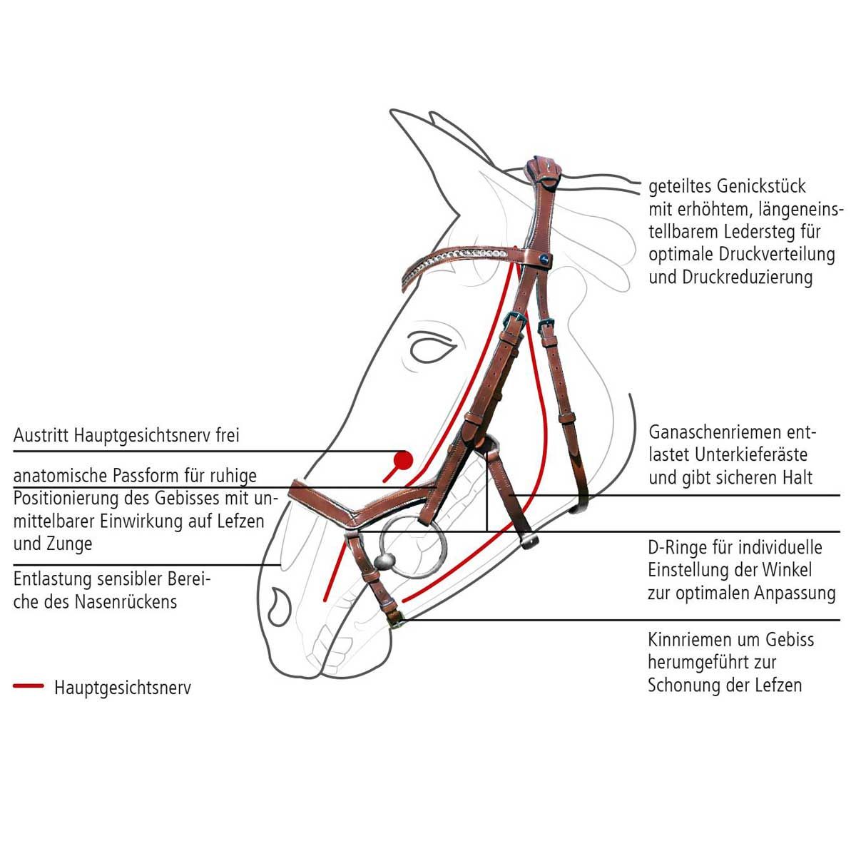 - zusätzlicher Ganaschenriemen sorgt in Verbindung mit dem Kinnriemen für eine Entlastung der Unterkieferäste und umschließt den Pferdekopf sanft und sicher