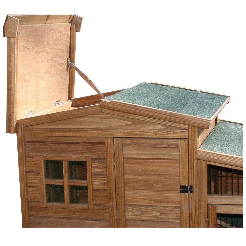Das hochwertige Gitter und das sehr stabile Bitumendach mit Dachfixierung halten jedem Wetter stand. Die hohe Kunststoffwanne kann herausgezogen werden und erleichtert somit die Reinigung. Der Stall besitzt 4 Türen, die getrennt voneinander zu öffnen sind.