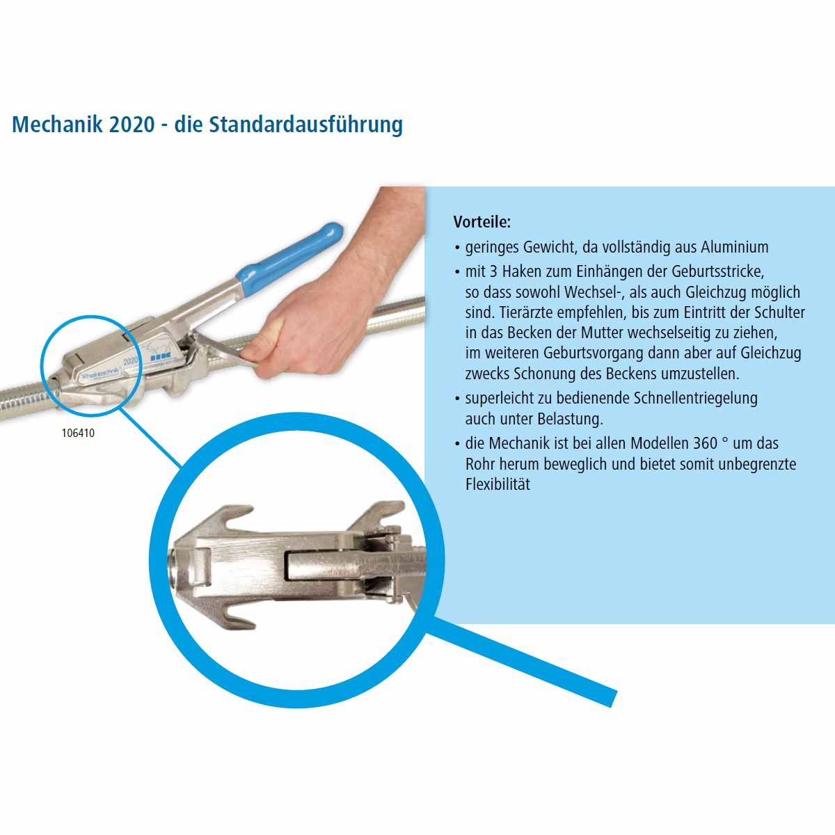 Die Mechanik 2020 des HK Geburtshelfers sorgt für eine gleichmäßige, schonende Kraftübertragung auf Stange und Geburtsstrick. Zum Einhängen der Geburtsstricke sind 3 Haken vorhanden, damit sowohl Wechselzug als auch Gleichzug möglich sind.
