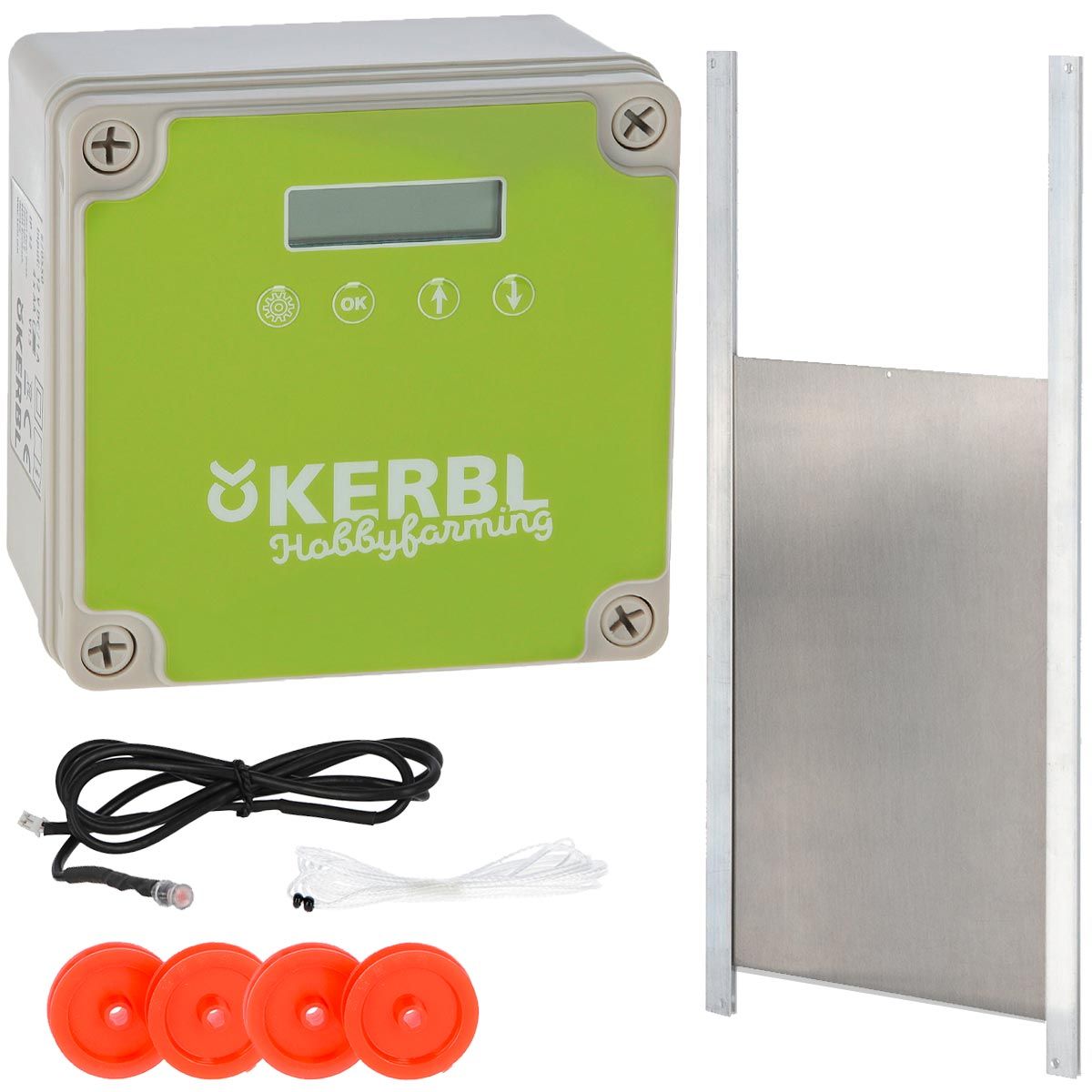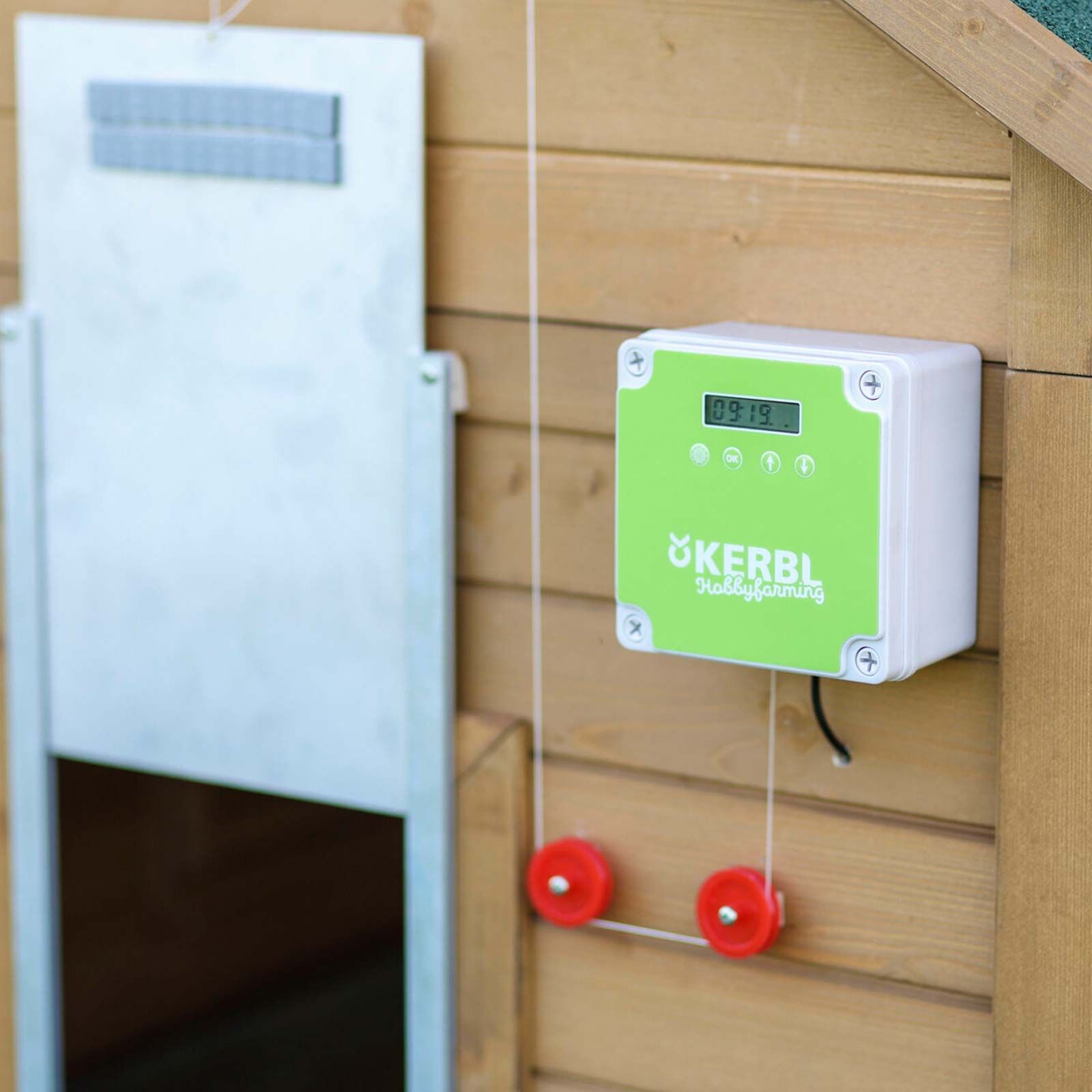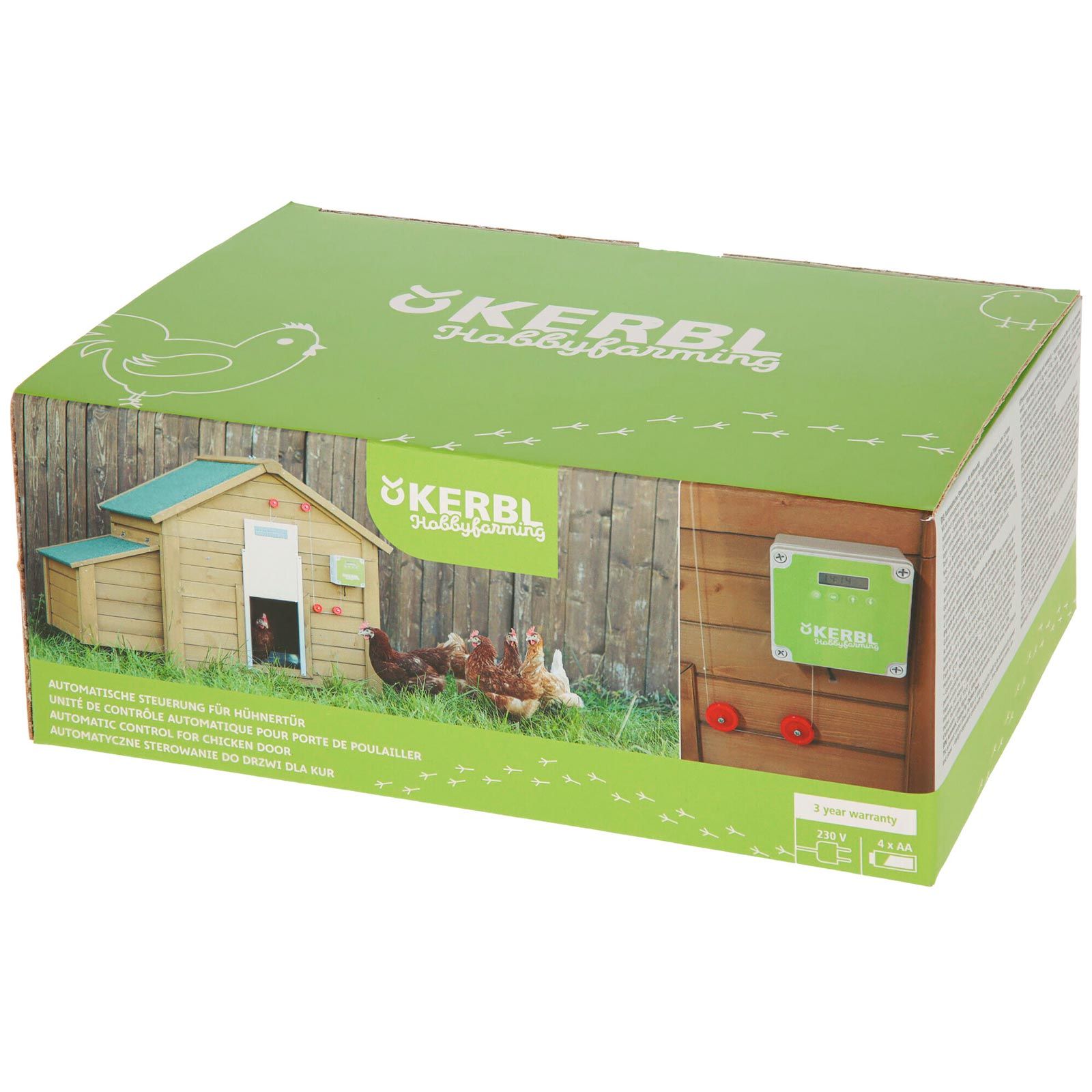 Mit der automatischen Hühnertür von Kerbl können die Hühnerklappen, Türen oder Schieber an Geflügelställen automatisch geöffnet und geschlossen werden. Die automatische Hühnerklappe verfügt über mehrere Funktionen zum Öffnen/Schließen der Klappe: