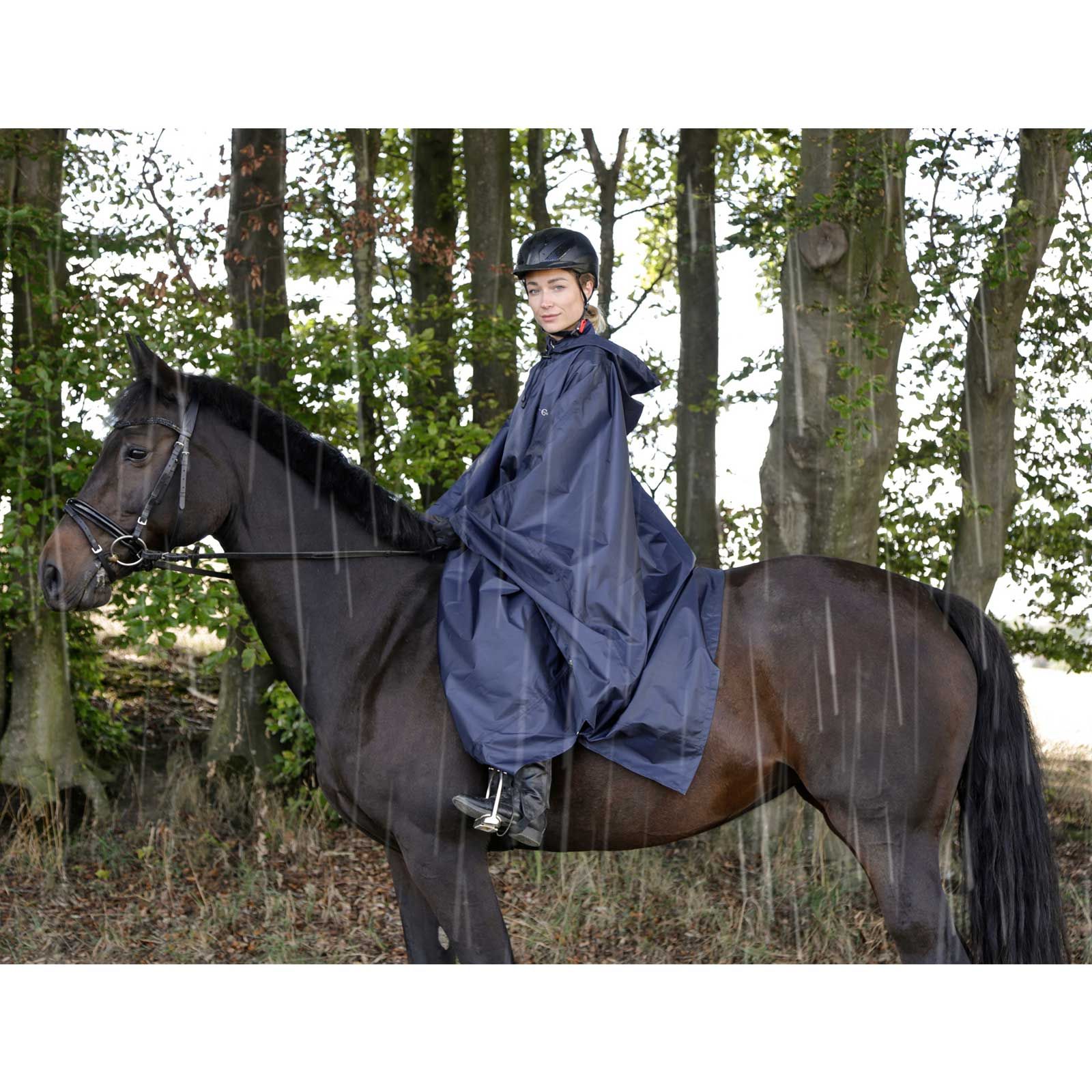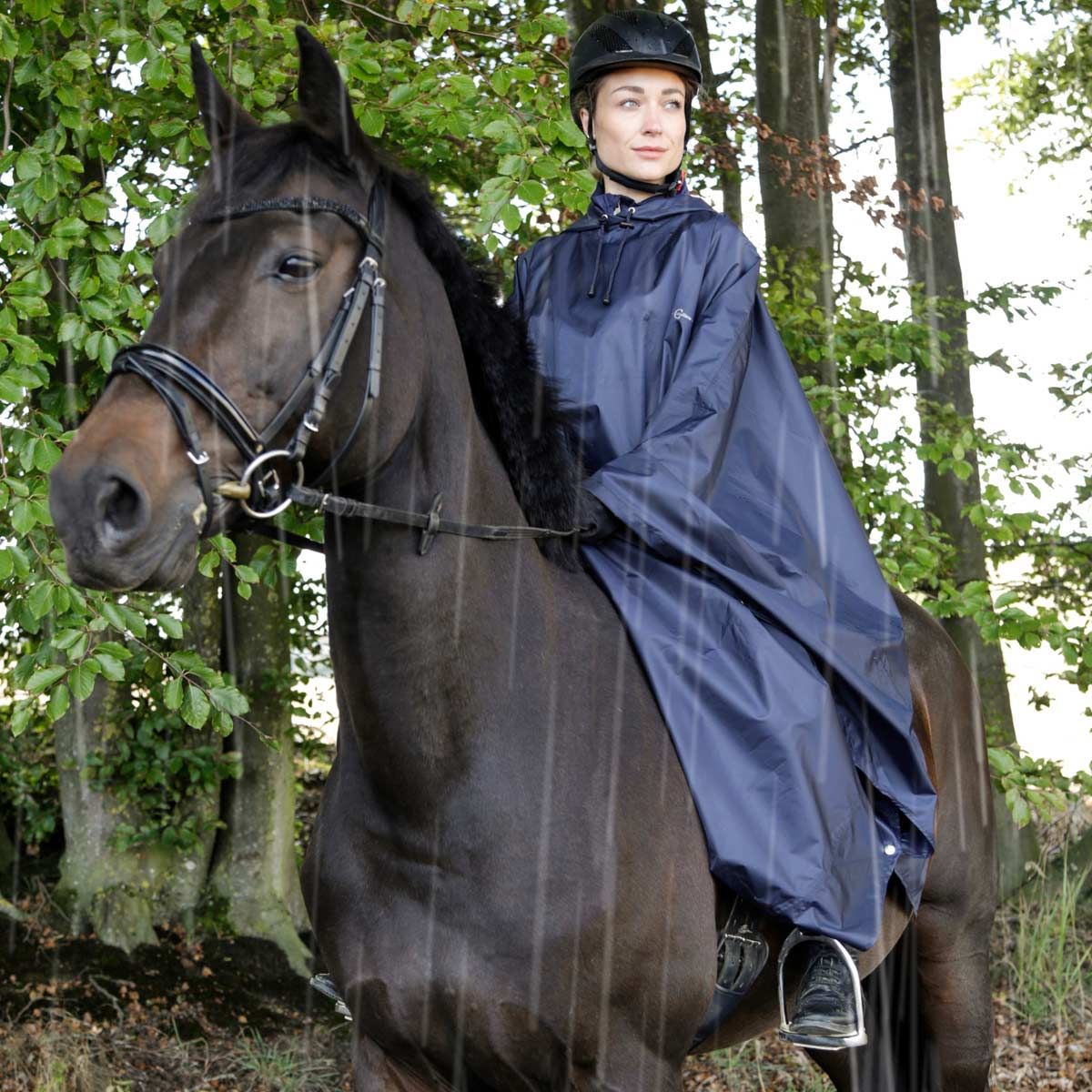 Der speziell entwickelte Reit-Regenponcho in Einheitsgröße für Erwachsene ist der ideale Wetterschutz gegen Regen. Spezielle Fußschlaufen des Reit-Regenmantels verhindern ein Abheben des Ponchos während des Reitens. Druckknöpfe an Halsöffnung und Seiten erleichtern den Einstieg und den komfortablen Sitz des Reitponchos. Der Poncho hat auch eine großzügige, integrierte Kapuze, die bei Bedarf über den Helm gestülpt werden kann. Abgeklebte Nähte und PU-Beschichtung sorgen für 100 % Wasserdichte.