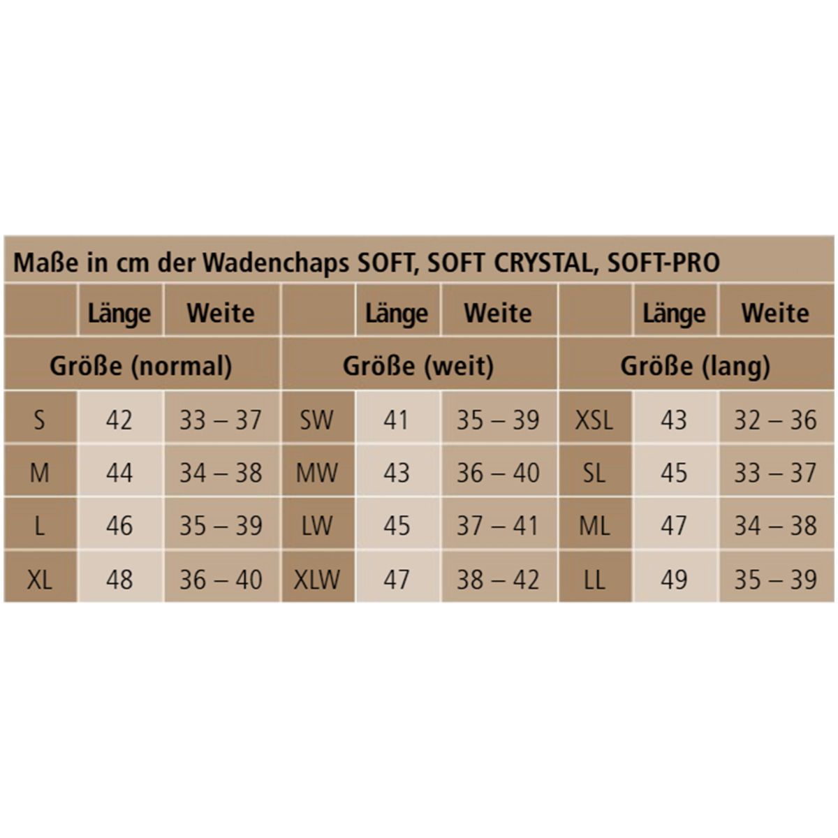Größen: S, SW, M, ML, MW, L, LL ,LW, XL, XLW, SL, XSL