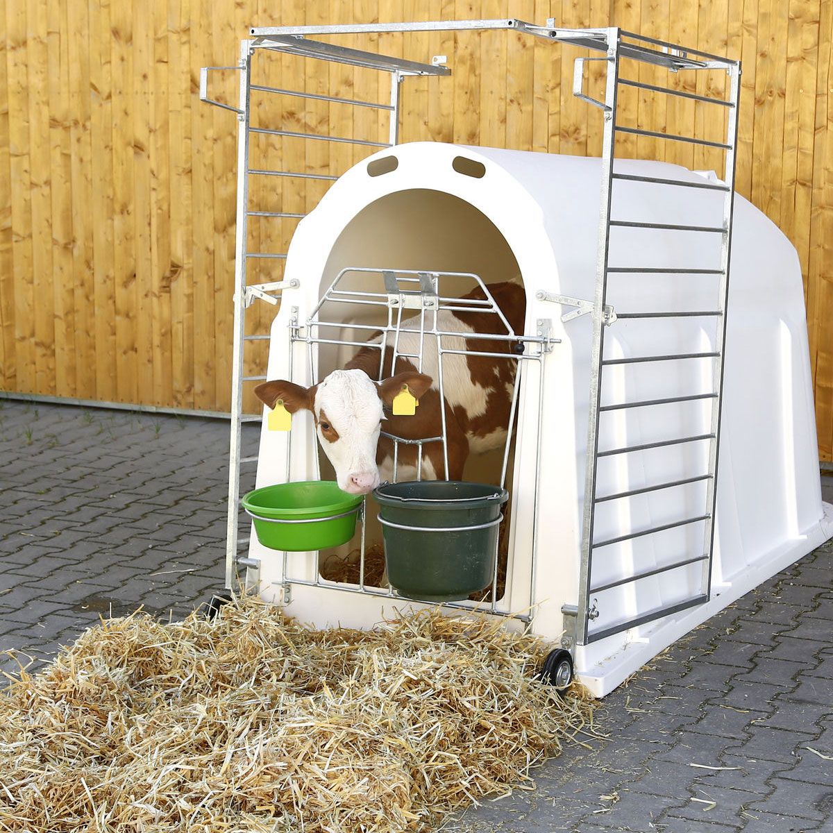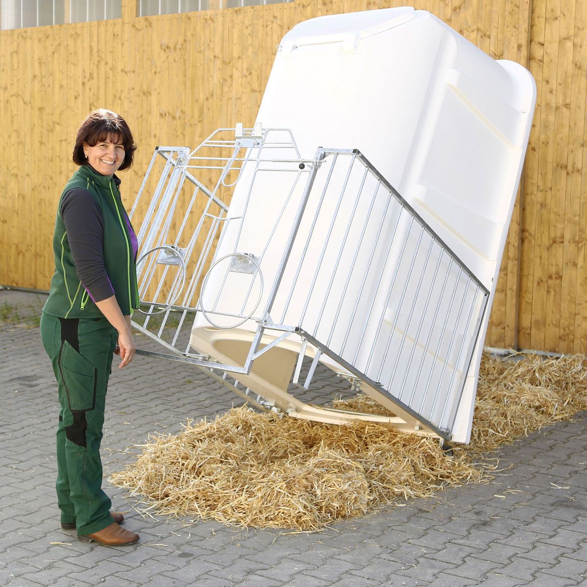 CalfHouse PE mit leichter Umzäungung und zusätzlichem UV-Schutz. Für eine hohe Stabilität und Langlebigkeit sorgt die Herstellung aus hochwertigem, schlagfestem HDPE-Kunststoff mit integrierten UV-Stabilisatoren. Eine optimale Klimatisierung der Kälberhütte wird durch die mehrstufig einstellbare und in allen Stufen fest arretierbare Belüftungsklappe erzielt. Sie erleichtert ebenso das Befüllen der Heuraufe. Die besonders glatten Innenflächen machen das Reinigen spielend einfach und verbessern dadurch die Hygiene. In der Hüttenform ist ein Handgriff zum Anheben der Kälberhütte integriert.