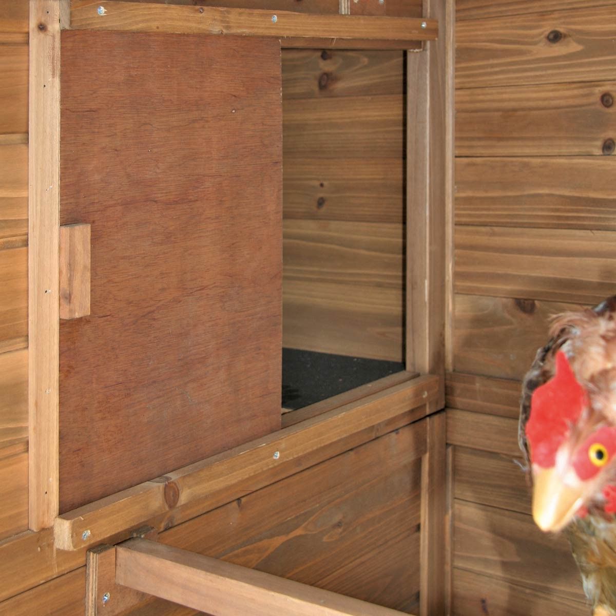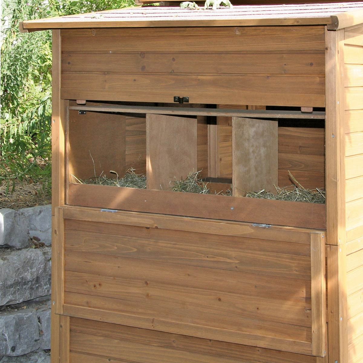 Die kunststoffbeschichteten Böden sorgen für eine hygienische Umgebung und erleichtern die Reinigung. Die zwei Etagen sind durch eine stabile Treppe verbunden, sodass die Hühner bequem zwischen den Ebenen wechseln können. Jedes Stockwerk verfügt über 3 von außen zugängliche Legenester für eine stressfreie Eiablage. Das Hühnerhaus ist robust und wetterfest, ausgestattet mit einem Bitumendach, das Schutz vor Witterungseinflüssen bietet. Die Holzschutzfarbe sorgt dafür, dass die Materialien langlebig und widerstandsfähig bleiben.