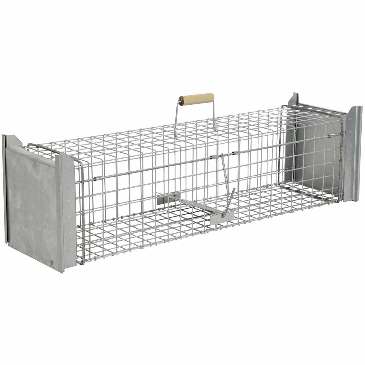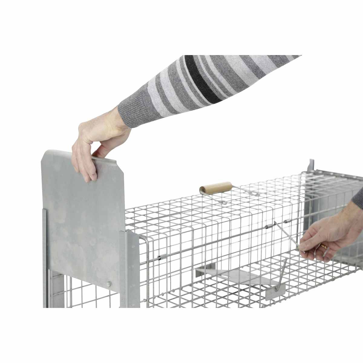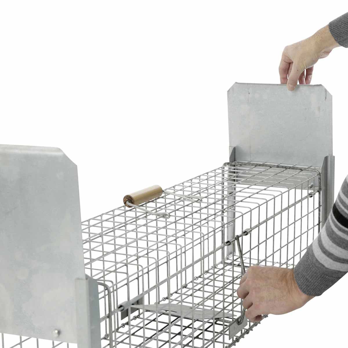 - Besonderheit der Falle 118 x 33 x 42 cm: Durch die mittig gelegene Türe kann der Köder ganz einfach in der Nähe der Trittplatte platziert werden