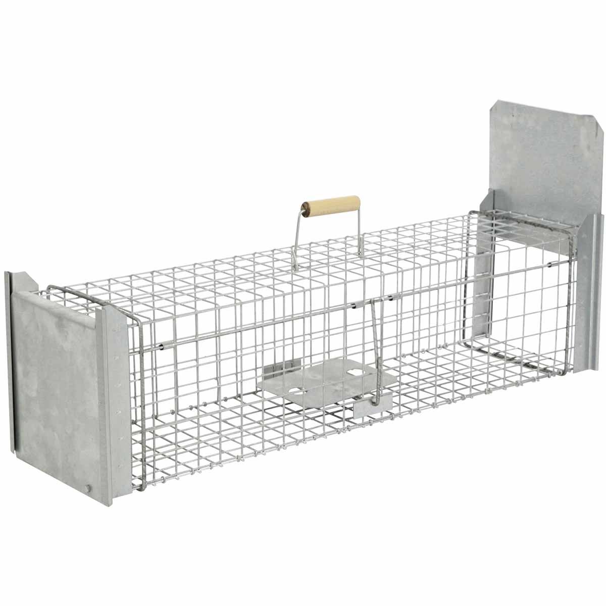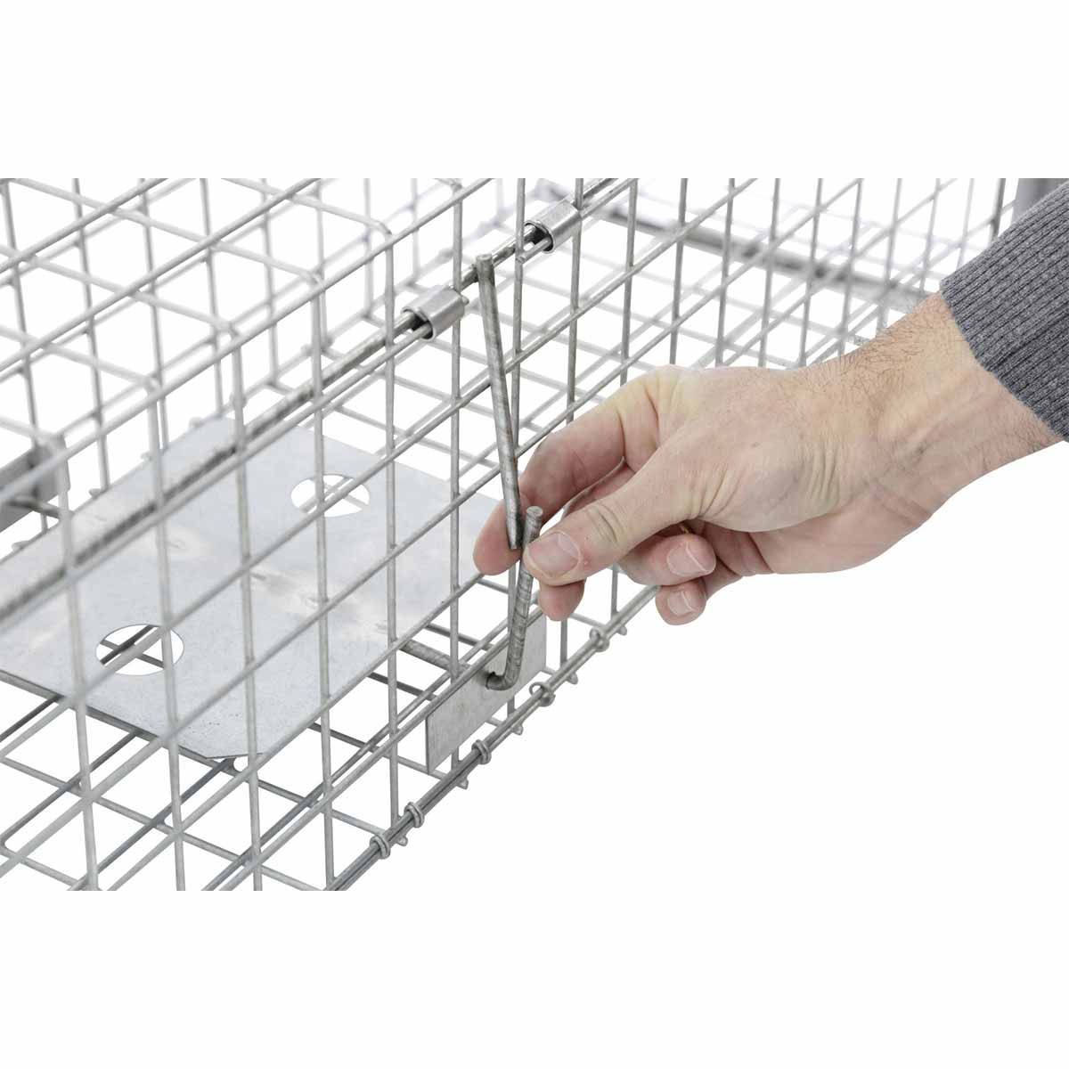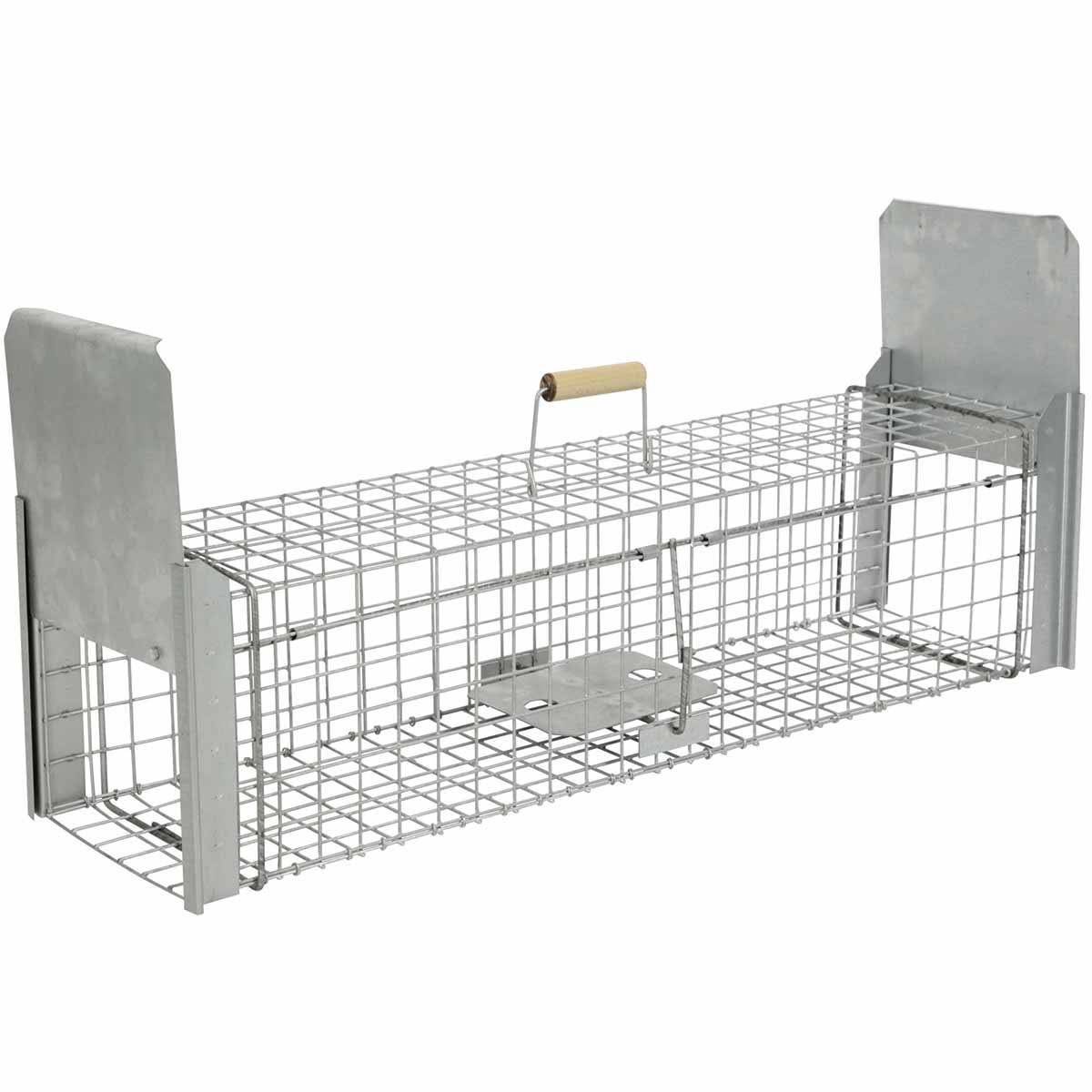 - Besonderheit der Falle 118 x 33 x 42 cm: Durch die mittig gelegene Türe kann der Köder ganz einfach in der Nähe der Trittplatte platziert werden