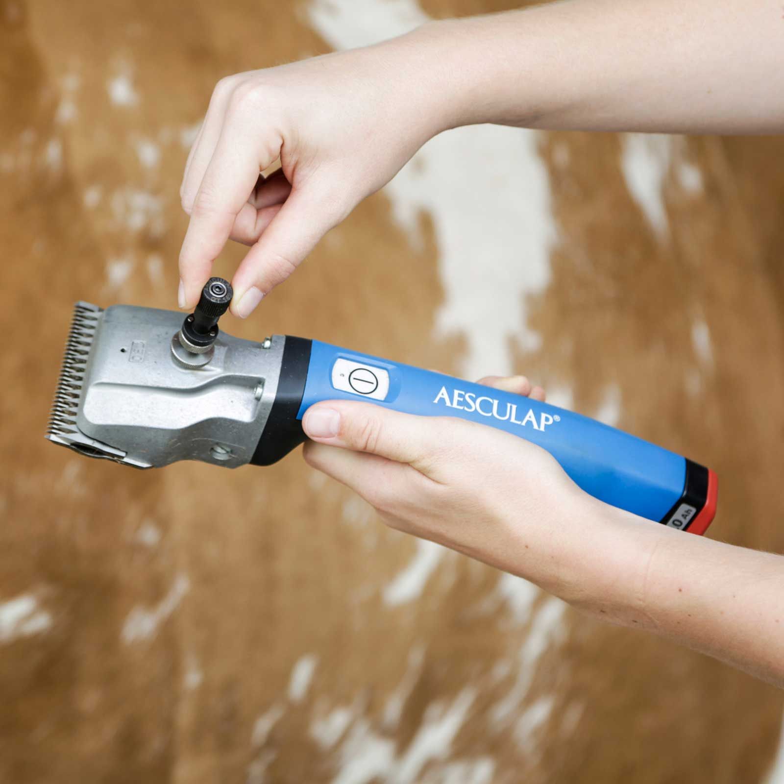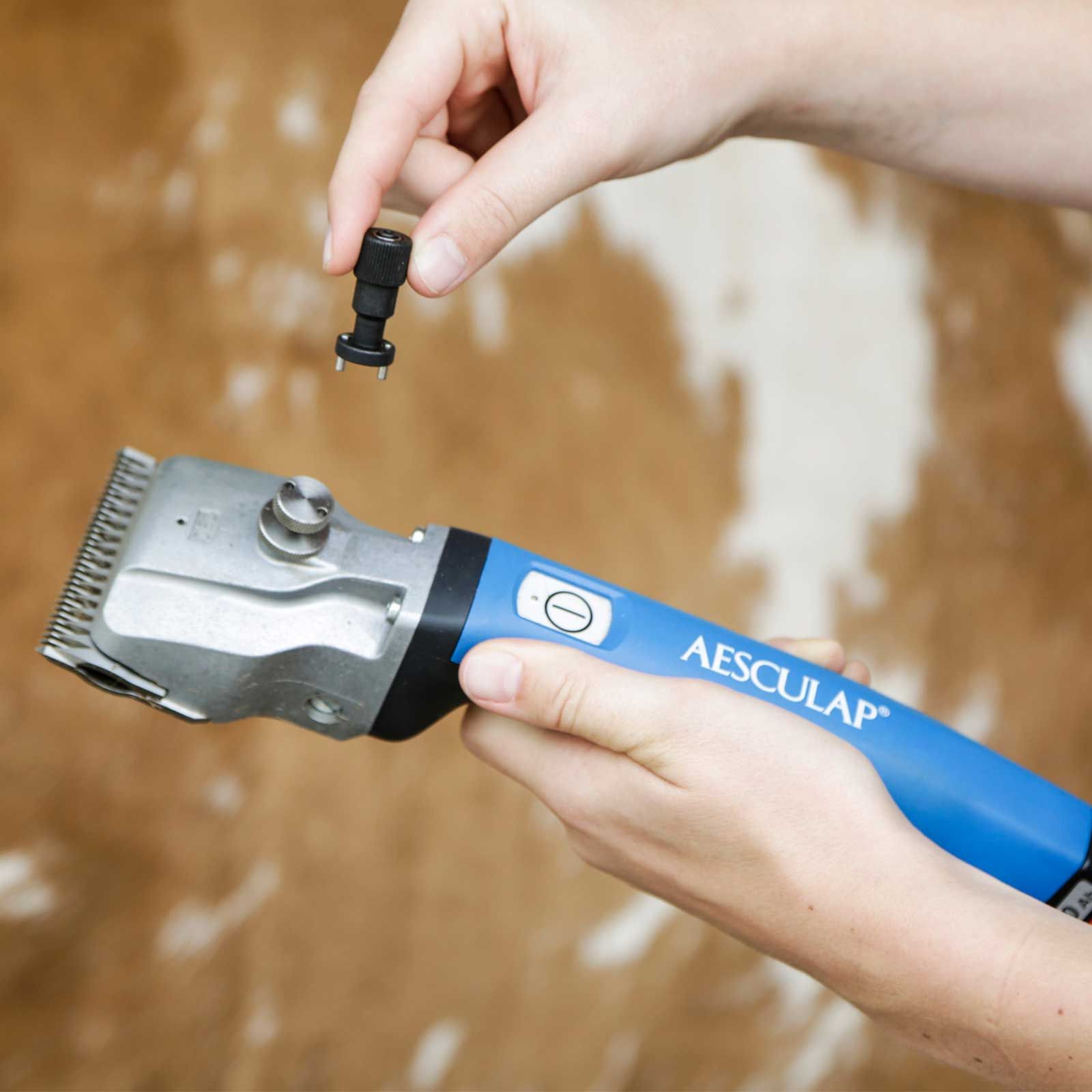 Mit diesem innovativen "Drehmomentschlüssel" lässt sich der Scherplattendruck bei Aesculap Rinder-/Pferde-Schermaschinen kinderleicht einstellen.