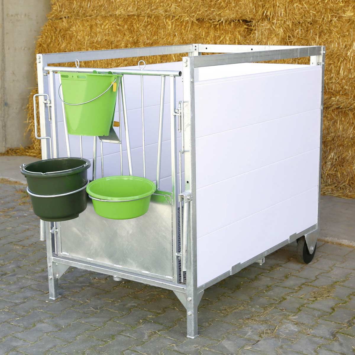 Die Kälberbox wird als Bausatz geliefert. Die Fahrvorrichtung ist optional erhältlich.