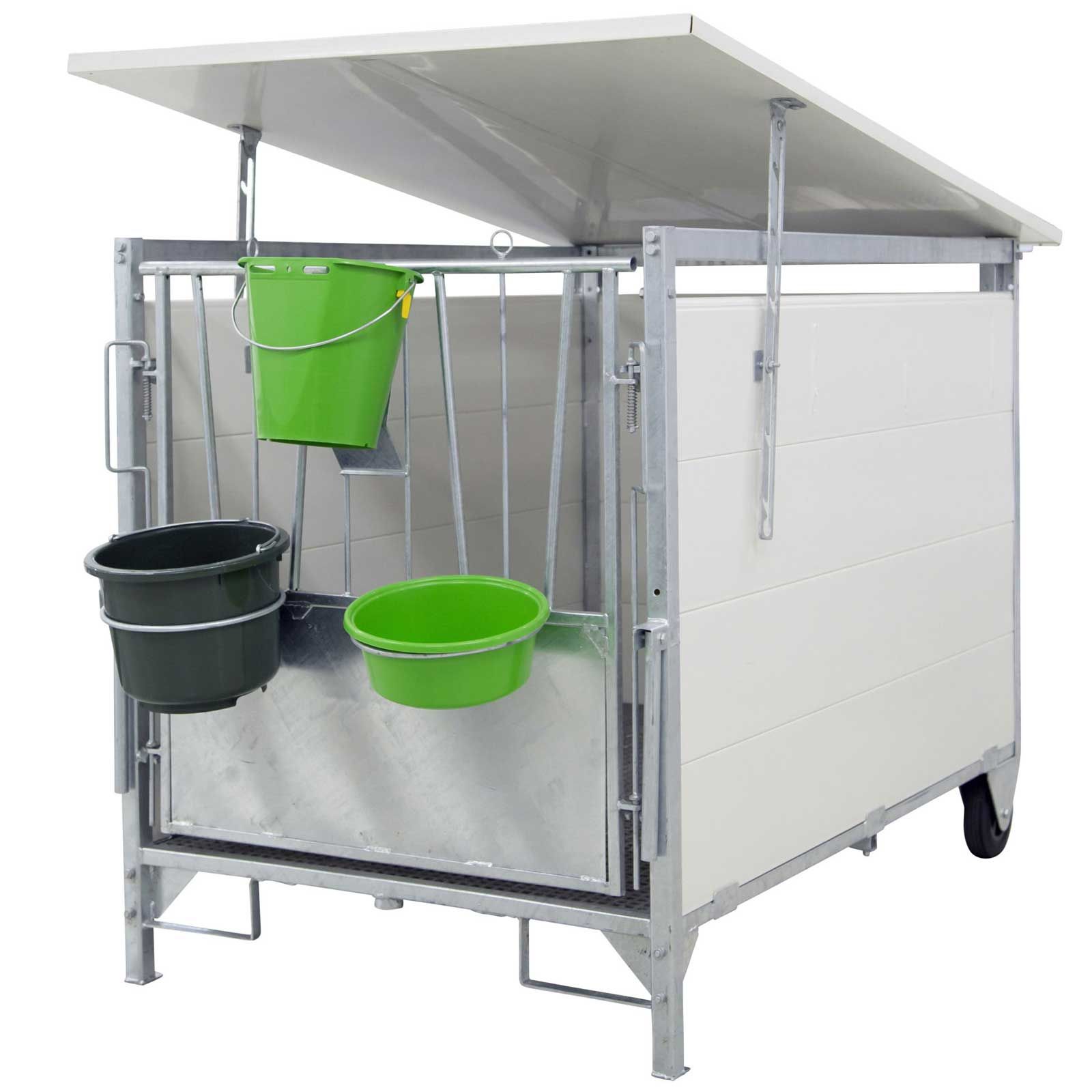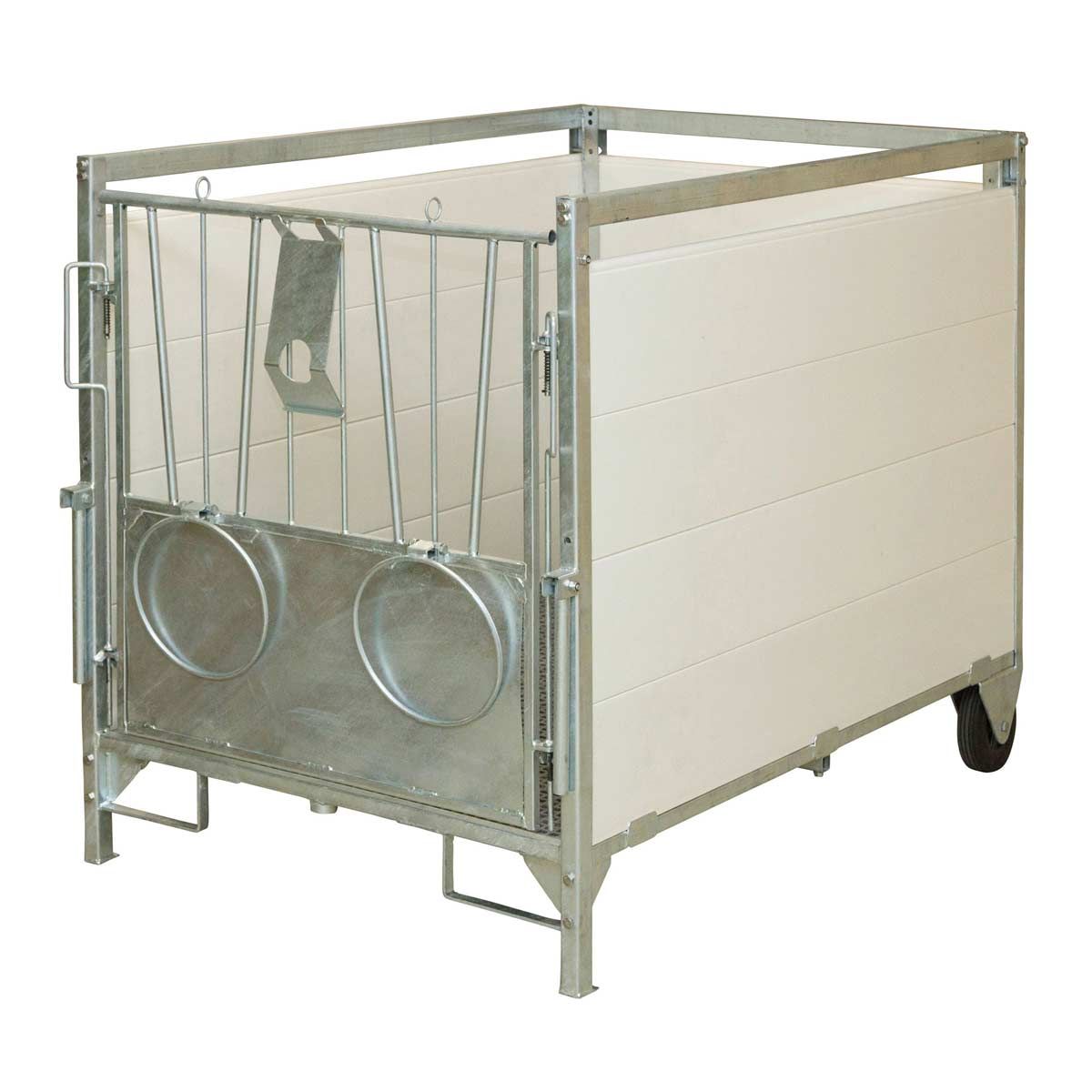 Die extra großen Gummiräder und Klappgriffe an der Vorderseite ermöglichen das einfache Versetzen der Kälberbox. Durch den stabilen, verzinkten Metallrahmen ist ein Transport mit Palettengabeln möglich.