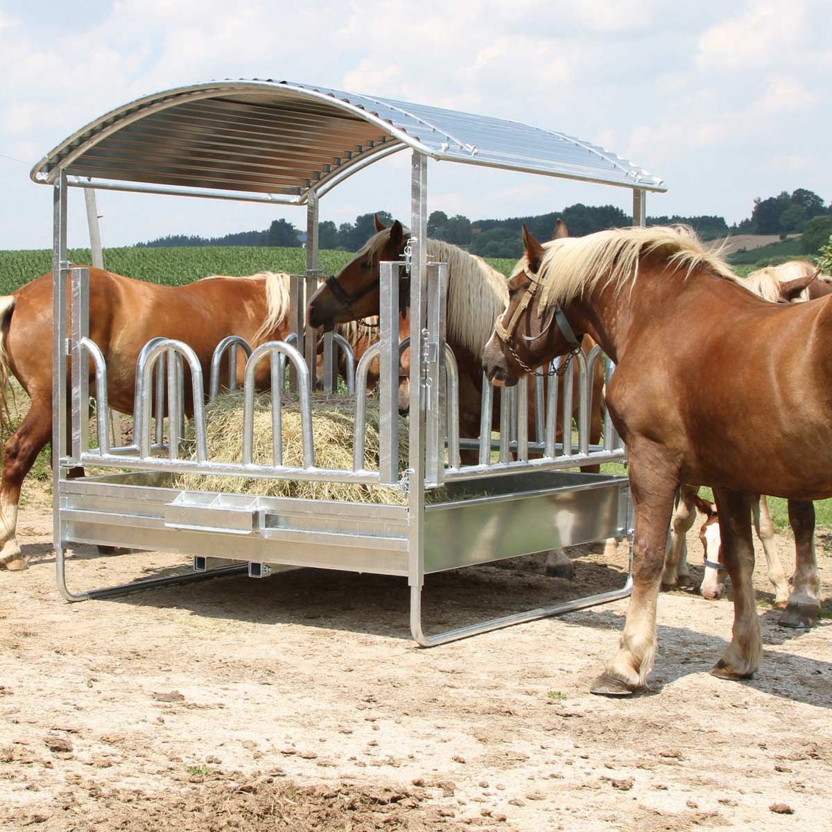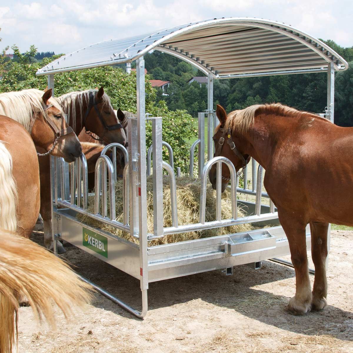 Die Heuraufe mit Dach sorgt dafür, dass das Futter trocken bleibt und nicht am Boden verschmutzt wird.