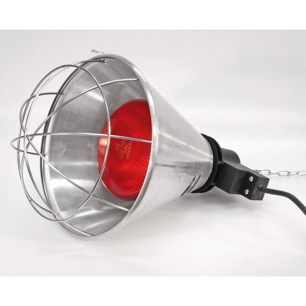 Der Aluschirm hat einen Durchmesser von 21cm und ist mit 6 Lüftungsschlitzen ausgestattet, um eine bessere Luftzirkulation zu gewährleisten. Die Infrarot Glühbirne ist durch ein Gitter geschützt und eine Befestigungskette ist im Lieferumfang enthalten.