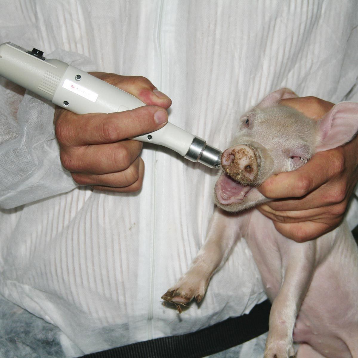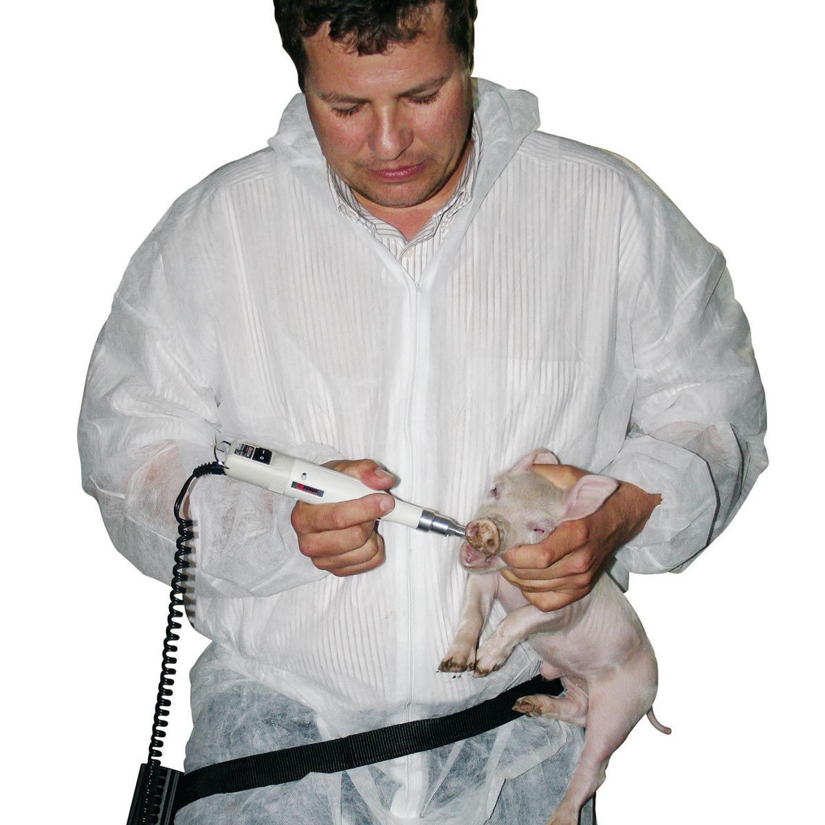 Das Akku Zahnschleifgerät ProPig vereinfacht die Arbeit, reduziert das Infektionsrisiko erheblich und ist besonders schonend für die Tiere. Der Schleifer ist über ein Spiralkabel an einen Akku angeschlossen.