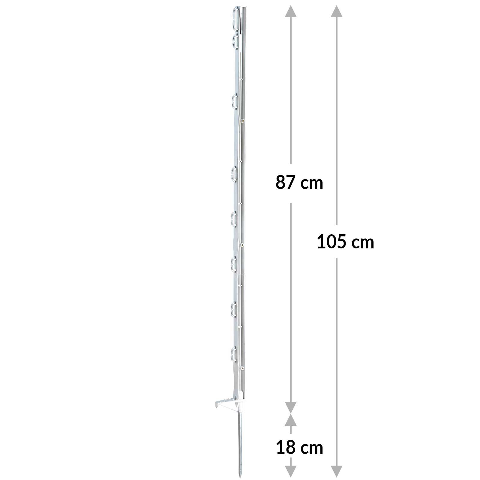 Der Kunststoffpfahl ist für alle gängigen Bänder, Seile, Litzen oder Drähte geeignet, was ihn zu einer vielseitigen Wahl für jeden Anwender macht. Mit insgesamt 7 Ösen, darunter 7 für Bänder mit einer Breite von 2cm oder Seile und 1 Öse für ein Band mit einer Breite von 4cm, bietet der Kunststoffpfahl viele Möglichkeiten zum Aufstellen eines Weidezauns. Die Gesamtlänge des Weidezaunpfahls beträgt 105 cm, während die Länge über dem Boden 87 cm beträgt.