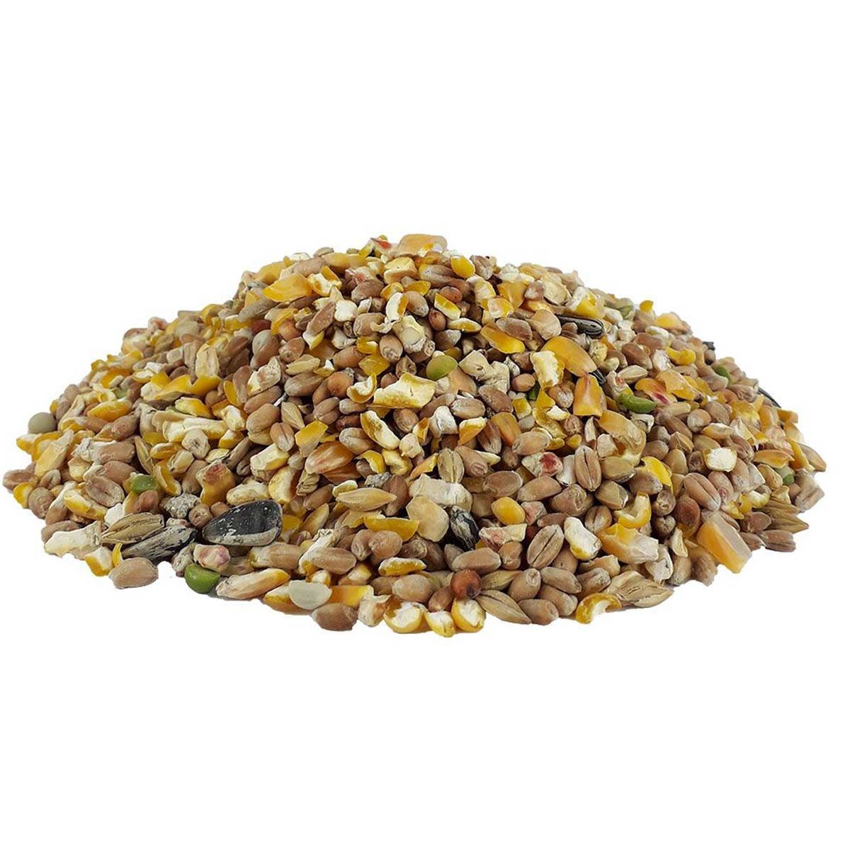 Zusammensetzung: 42,0 % Weizen; 42,0 % Mais geschrotet grob; 5,0 % Braugerste; 5,0 % Milokorn; 3,0 % Muschelgrit; 2,0 % Erbsen grün klein; 1,0 % Sonnenblumenkerne gestreift