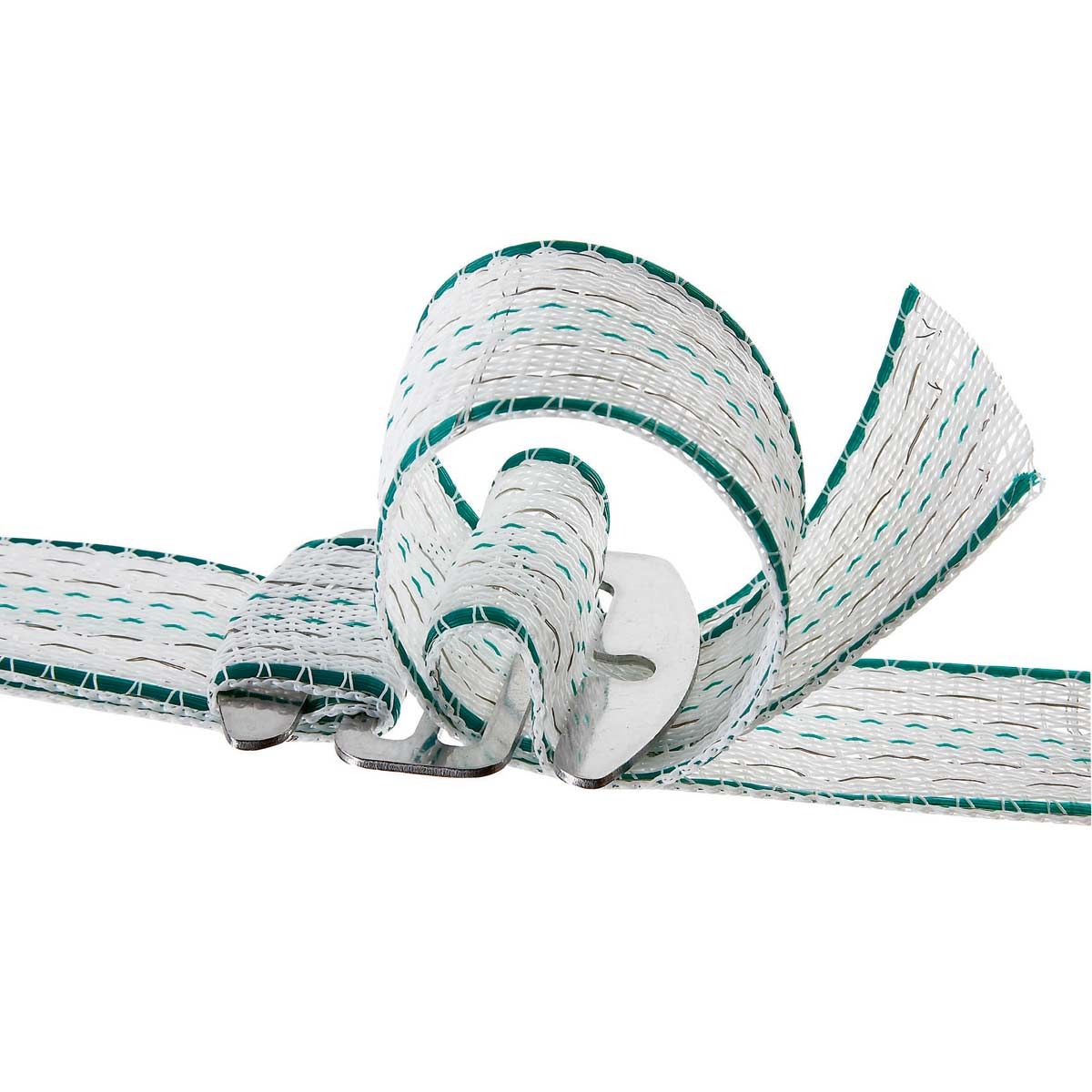 Weidezaunbänder sollten nicht verknotet werden! Ein Knoten gewährleisten keinen Kontakt zwischen den Bändern und der Stromfluss wird so unterbrochen. Zudem kann das Zaunmaterial durch das abknicken beschädigt werden. Der Zaun verliert an Hütespannung und wird unsicher.