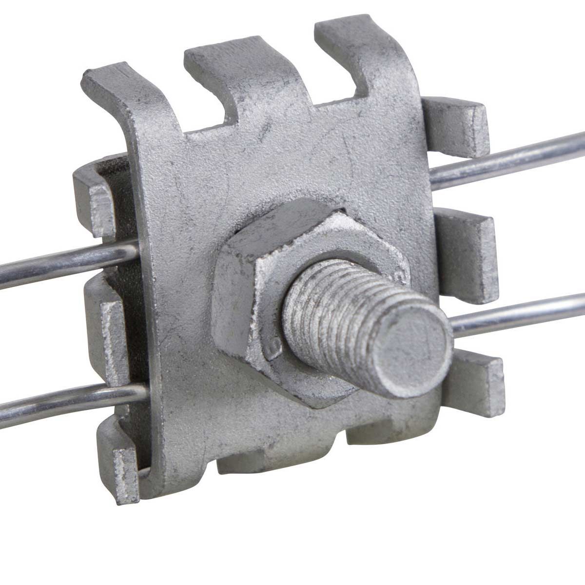 Die Drähte in der Verbindungsklemme werden ganz einfach mit einer großer Befestigungsmutter und Unterlegscheibe fixiert. Verbinder für Weidezaunbänder sind ein wichtiges Werkzeug beim Drahtzaun-Bau. Die Klemme verbindet Stahldraht bis Ø 2,5 mm mit Eisendraht und stellt den Anschluss des Untergrundkabels mit dem Zaundraht her. Die robuste Klemme ist schnell montiert und sichert eine sichere elektrische Verbindung.