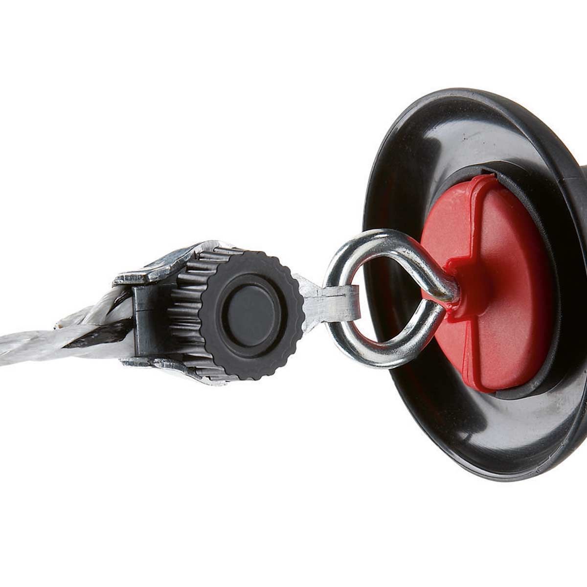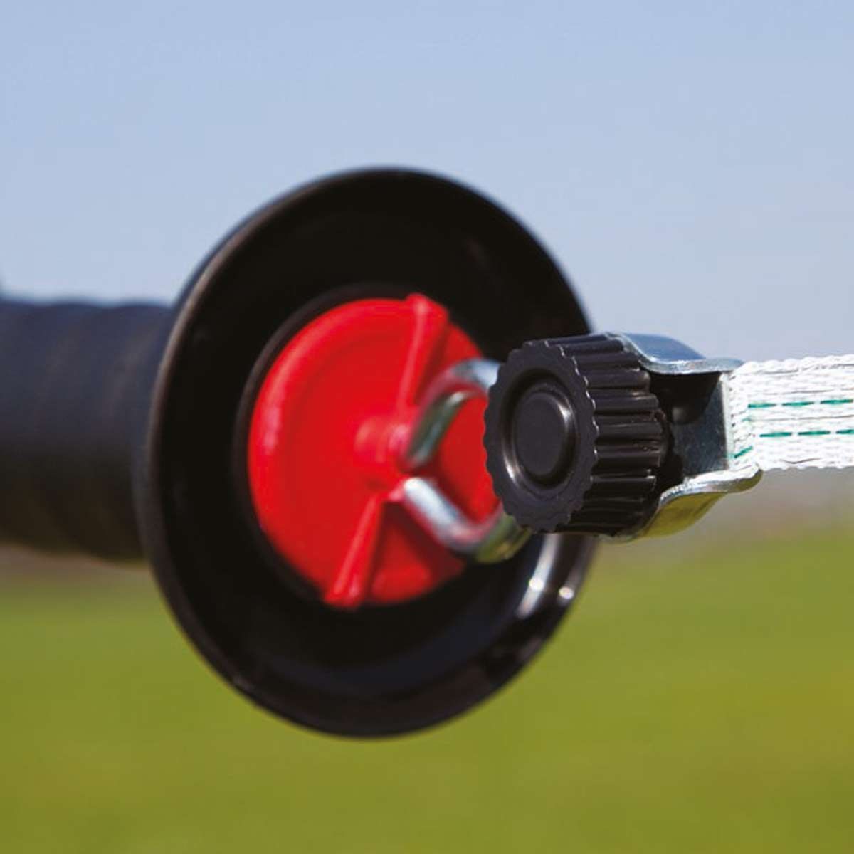 Mit diesem neu konzipierten Seilanschluss lässt sich das Weidezaunseil oder die Weidezaunlitze ohne Werkzeug einfach und sicher am Torgriff befestigen.