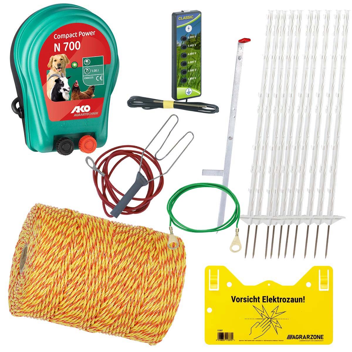 Zum Set gehört das 230 Volt AKO Weidezaungerät N700 mit reduzierter Stromabgabe, welches extra für die artgerechte Haltung von Haus- und Kleintieren entwickelt wurde. Auch enthalten im Set sind 250 m gut sichtbare Weidezaunlitze und 10 Kunststoffpfähle mit 8 Ösen zur Befestigung der Litze. So können Sie die Zaunhöhe und Länge individuell Ihren Bedürfnissen anpassen, bis zu 8 Reihen und maximale Höhe von ca. 105 cm sind möglich!
