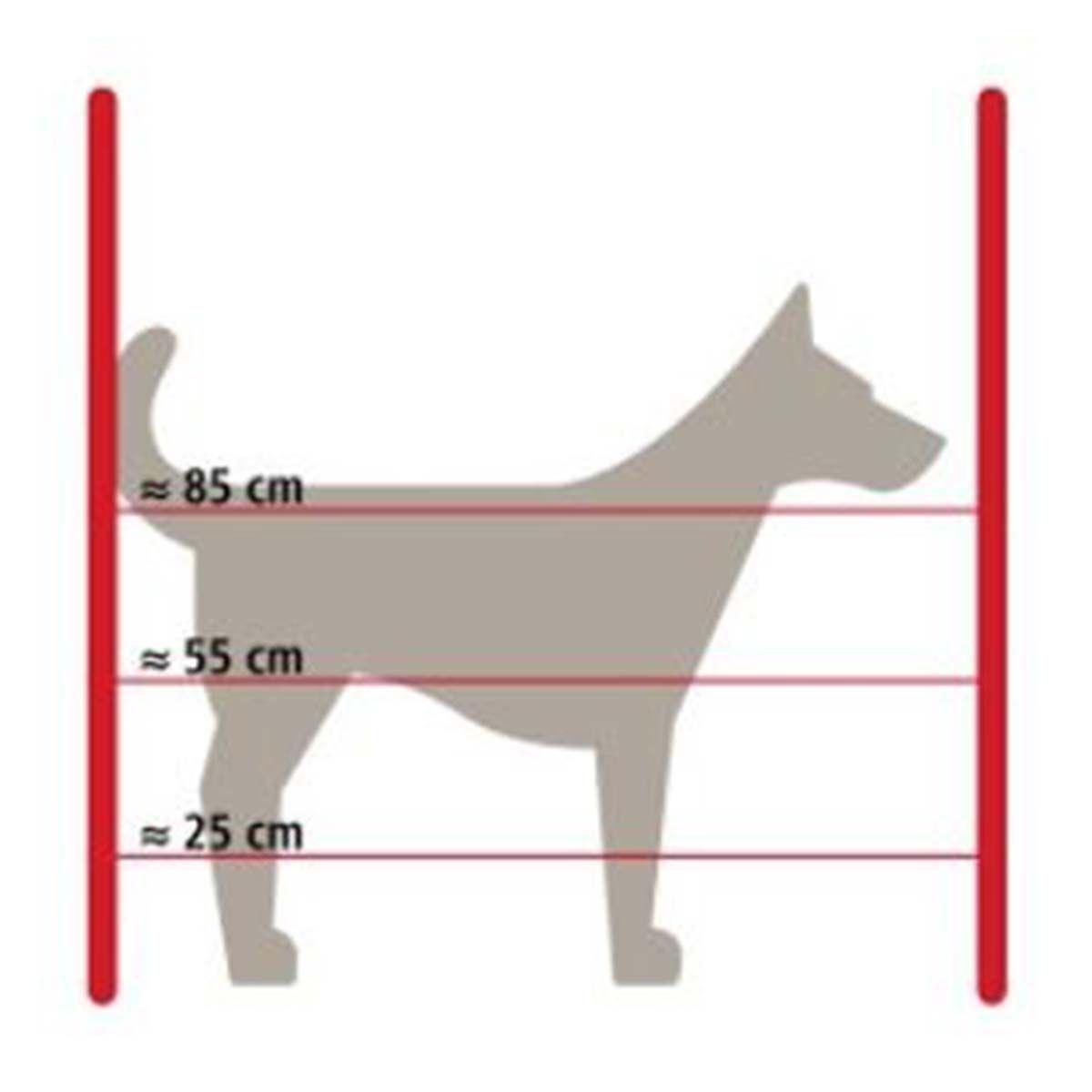 Hinweis: Richten Sie sich bei der Zaunhöhe nach der Größe Ihres Hundes. Für kleine Hunderassen (Schulterhöhe bis 39 cm) wird eine min. 3 reihige Einzäunung im unteren Bereich des Zaunes empfohlen, hingegen bei springfreudigen Hunden und größeren Rassen ab 60 cm Schulterhöhe eine ca. 6 reihige Einzäunung sinnvoll ist. Bei Bedarf können Sie den Hundezaun leicht mit weiterer Weidezaunlitze erweitern. Um eine optimale Stromversorgung am Zaun zu gewährleisten, sollte der Schutzzaun keinen starken Bewuchs haben. Ebenso empfehlen wir Ihnen einen externen Blitzschutz zu verwenden.