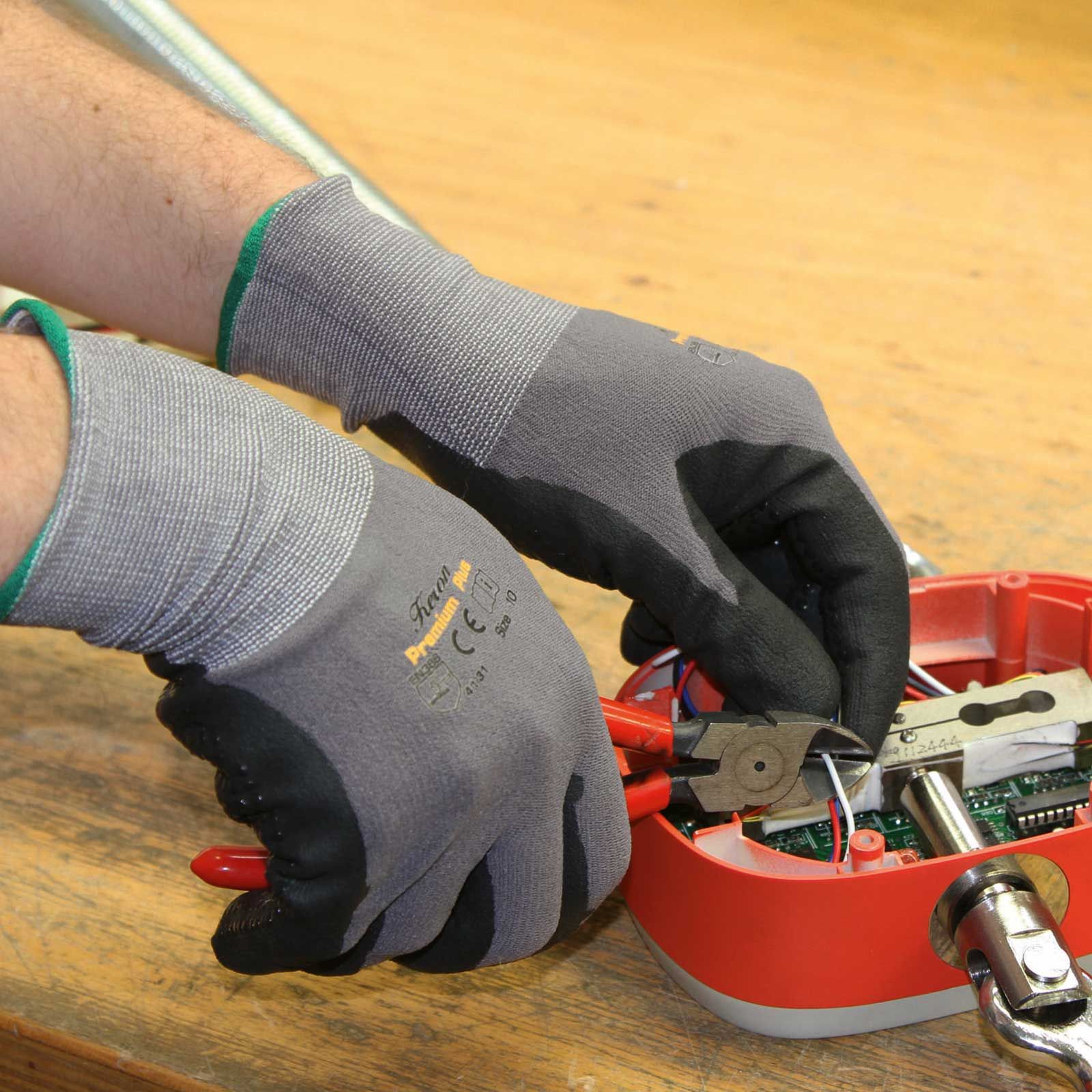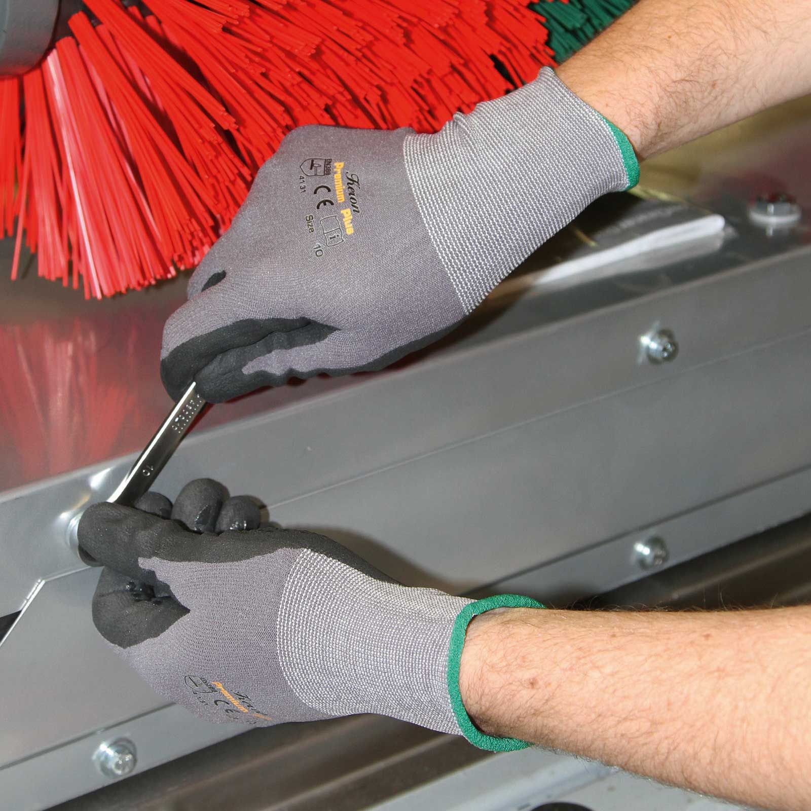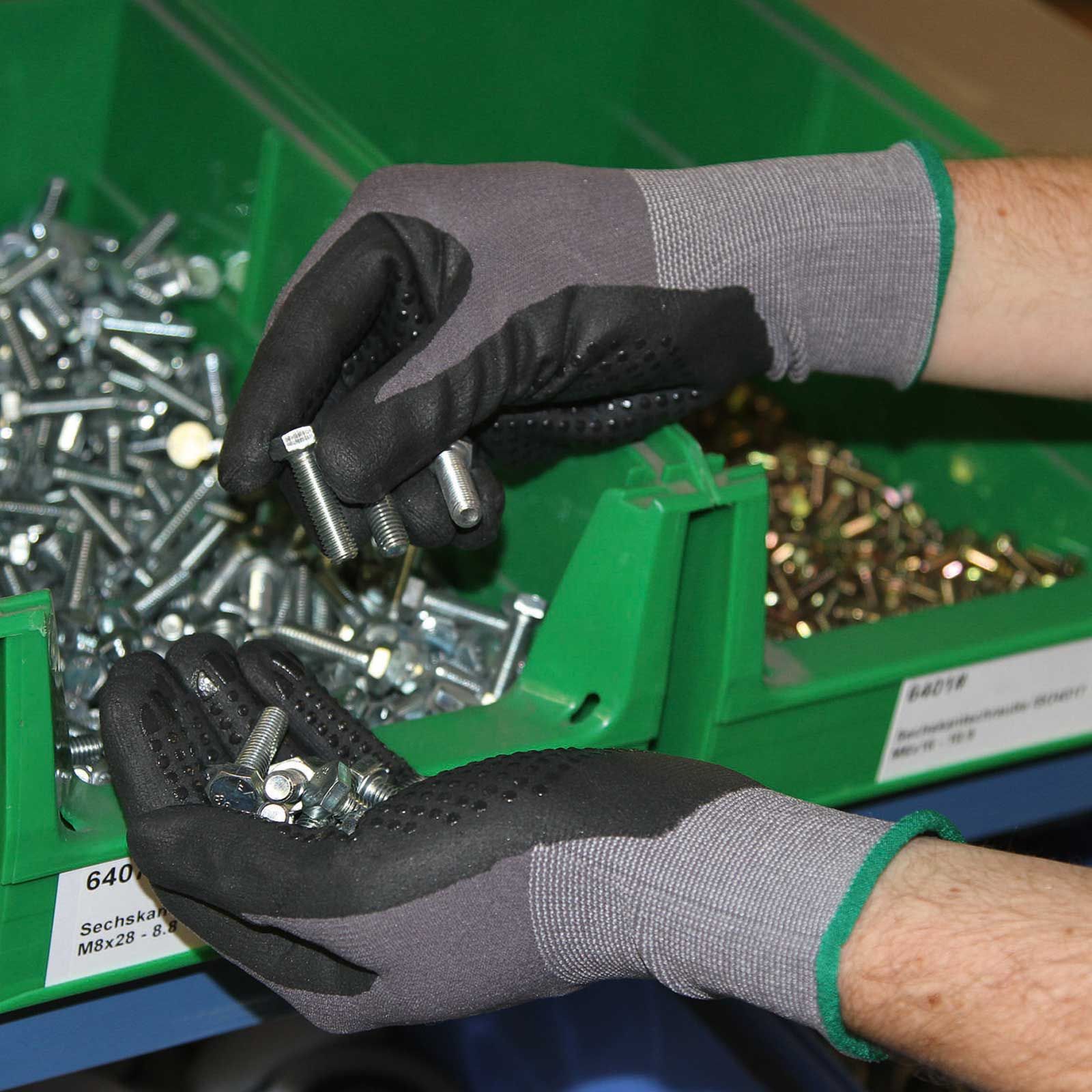 Noppen an der Handinnenseite sorgen für sehr gute Trockengriffeigenschaften. Dadurch ist der lösungsmittelfreie (DMF) Handschuh perfekt für Arbeiten mit hohen Anforderungen an das Tastgefühl geeignet. Zu den möglichen Einsatzbereichen zählen die Automobilindustrie, Montagearbeiten, Elektronik, Sortierarbeiten oder auch Malerarbeiten.
