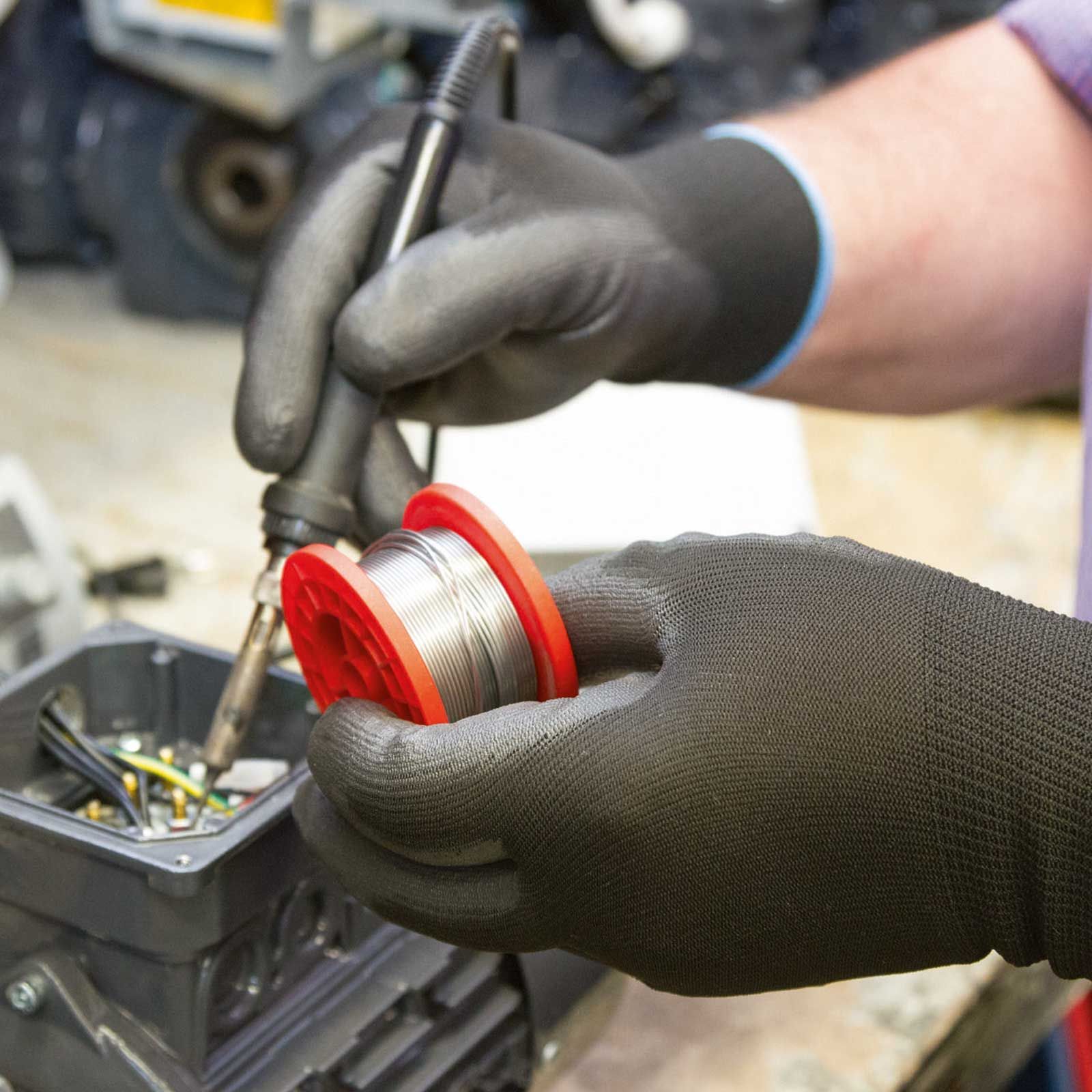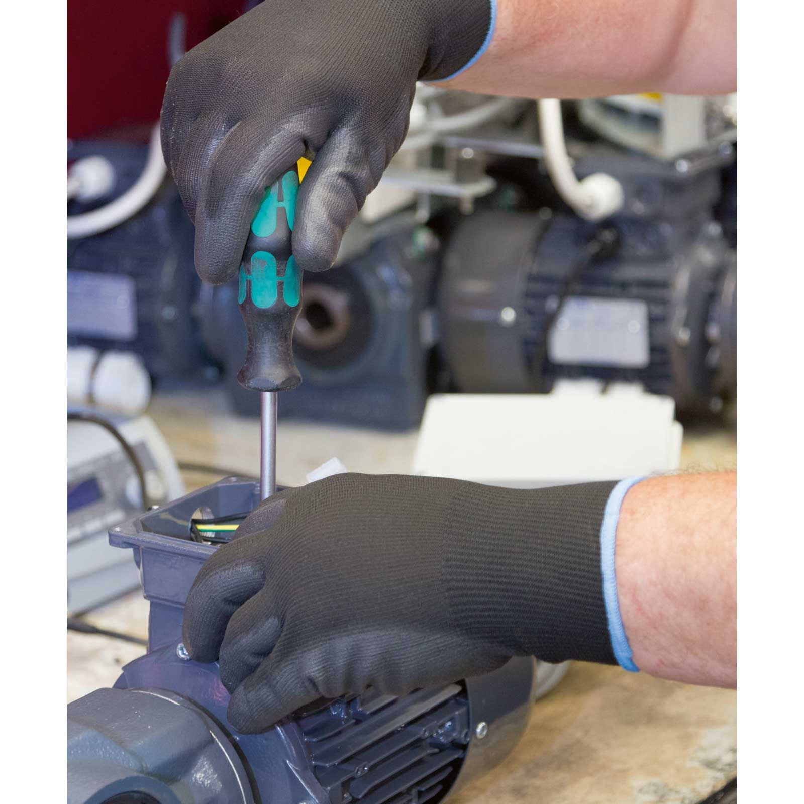 Der nahtloser Feinstrickhandschuh (13 Gauge) sorgt für ein sehr gutes Tastempfinden, die Passform gleicht einer zweiten Haut. Die PU-Beschichtung ist verantwortlich für den exzellenten Nass- und Trockengriff. Die Beschichtung ist auf Lösungsmittelbasis und der Handschuh ist so optimal für den industriellen Einsatz, aber auch für Maler- oder Packarbeiten geeignet.