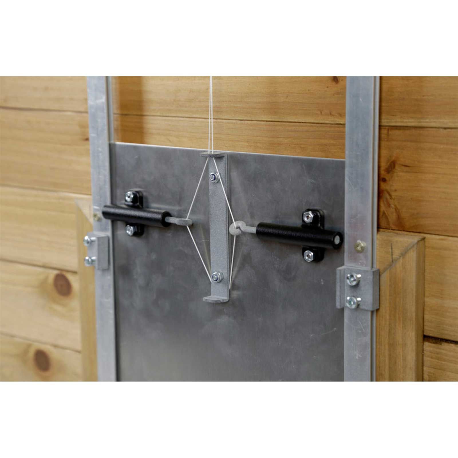 Mit diesem Nachrüstsatz für den Schieber der automatischen Hühnerklappe haben Fuchs, Waschbären & Co. keine Chance mehr. Bei Erreichen des unteren Anschlags verriegeln Bolzen die Türe. Der Schieber kann nun nicht mehr angehoben werden und die Tiere sind sicher vor potentiellen Angreifern.