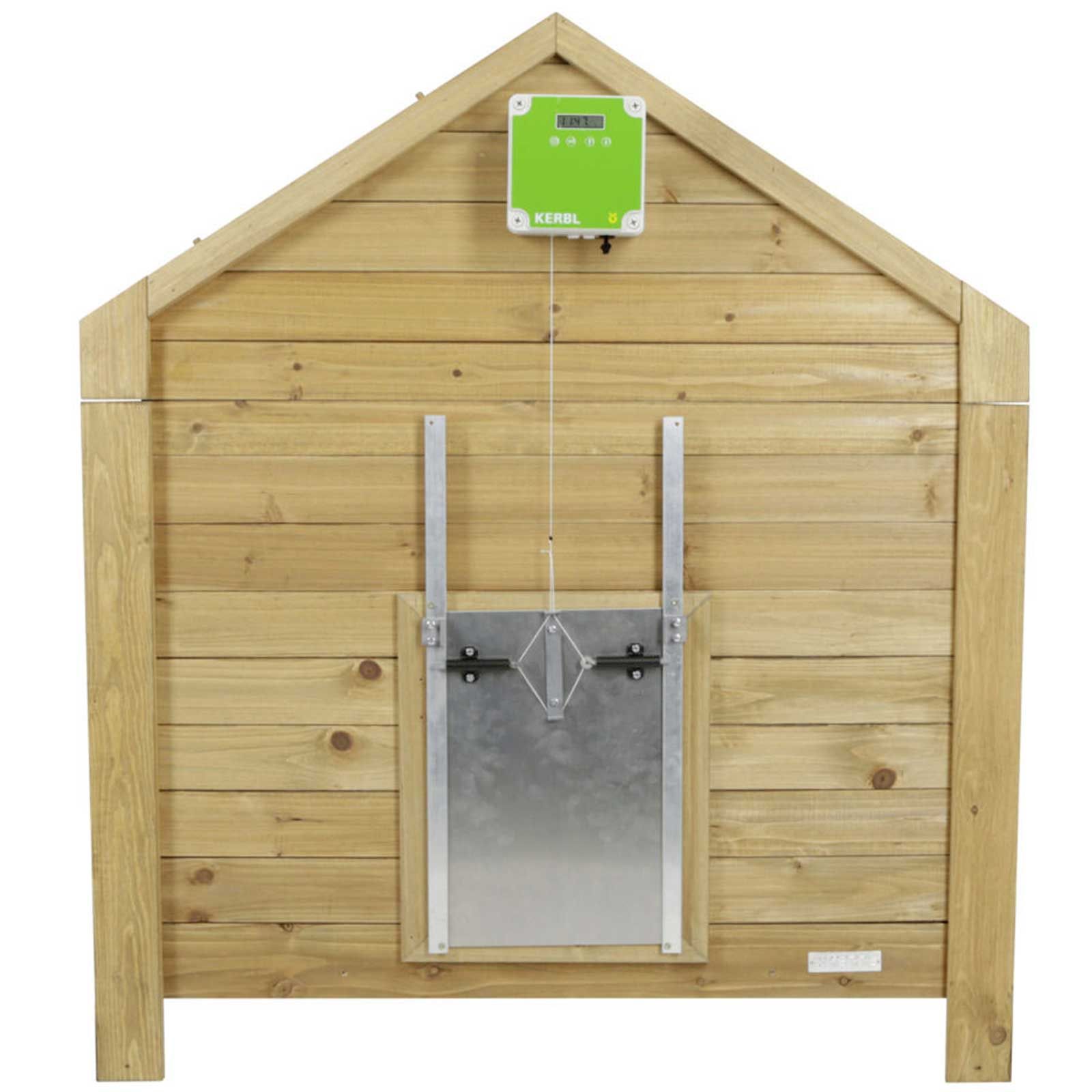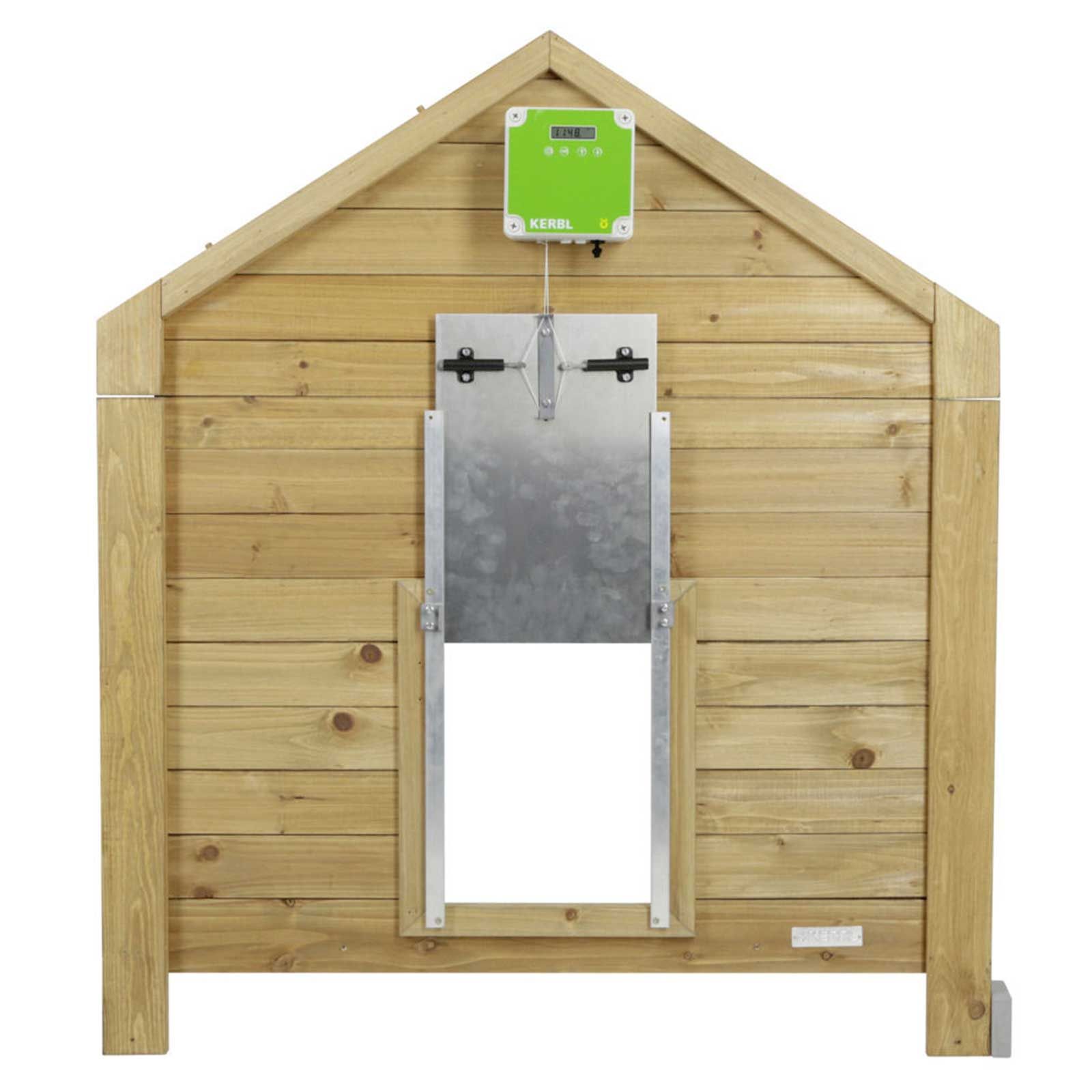 Automatische Hühnerklappe - Hühnertür automatisch Öffnen & SchließenMit der automatischen Hühnertür können Hühnerklappen, Türen oder Schieber an Geflügelställen tageszeit- oder helligkeitsabhängig automatisch geöffnet und geschlossen werden.Die Geflügelklappe öffnet den vertikalen Schieber zu Ihrem Geflügel- oder Hühnerstall zu fix eingestellten Zeiten oder mittels Lichtsensor wenn es hell wird bzw. schließt die Türe wieder, sobald es dunkel wird. Zusätzlich ist eine manuelle Bedienung des Gerätes möglich. Entweder direkt am Gerät oder mit einem manuellen Taster (nicht im Lieferumfang enthalten). Die Empfindlichkeit des integrierten Dämmerungsschalters ist individuell einstellbar, sodass ein ungewolltes Öffnen bei Gewitterblitzen, nahegelegegnen Leuchten oder Hallenstrahlern verhindert wird.Sollte sich während des Schließvorganges der automatischen Hühnerklappe ein Tier unter dem Schieber befinden, wird der Motor des Hühnertür-Pförtners beim Aufsetzen automatisch gestoppt und schließt weiter, wenn sich das Tier befreit hat.Überblick:Automatischer TüröffnerNetzbetrieb und Batteriebetrieb möglichTageslichtabhängige Steuerung mit LichtsteuerungZeitabhängige SteuerungManuelle Steuerung, am Gerät oder über angeschlossenen TasterDie Funktion der Geflügelstalltür:Per Dämmerungsschalter wird der integrierte Motor der automatischen Geflügelstallklappe gesteuert und damit das Öffnen bzw. Schließen eines vertikalen Schiebers mittels Seilzug realisiert. Zusätzlich ist die manuelle Bedienung möglich. Das Gehäuse der selbstöffnenden Hühnertüre ist extrem stabil und schützt die feine Elektronik vor Feuchtigkeit, Schmutz und Sonneneinstrahlung. Leicht geschützt platziert, hält der elektronische Schieber, durch seine extrem langlebigen Bauelemente, viele Jahre.Funktionen zum Öffnen bzw. Schließen der Klappe:Lichtsensor: Die Hühnerklappe wird tageslichtabhäng mit Lichtsensor gesteuert.Zeitschaltuhr: Steuerung der Hühnertür erfolgt zeitabhängig. Zwischen Wochentagen und Wochenende kann unterschieden werden.Manuelle Steuerung: Direkt am Gerät oder über einen angeschlossenen Taster.Montage der automatischen Hühnerklappe am Hühnerstall:Die Montage der elektronischen Hühnerstalltür ist sehr simpel: Sie montieren zuerst den Schieber, ziehen diesen in die geöffnete Position, montieren das Hühnerklappen-Gerät so, dass sie ihn durch die Schlaufe mit dem Schieber verbinden können (eingerollte Schnur = Auslieferungszustand). Danach legen Sie die Batterien ein - fertig!Planen Sie die Montagesituation und vor allem die Schnurführung von der Hühnertür bis zum Gerät. Messen Sie die Öffnung der Hühnerklappe aus und legen Sie eine geeignete Schiebetür mit Führungsschienen bereit. Geeignete Schieber und zusätzliche Umlenkrollen finden Sie als Zubehör bei uns im Shop.Wenn Sie die automatische Hühner-Tür mit Netzspannung versorgen wollen, stellen Sie sicher, dass eine 230 Volt Steckdose in der Nähe zur Verfügung steht. Das Netzteil und der Montageort des Geräts muss vor Regenfall geschützt sein. Die automatische Hühnerklappe ist nicht mit Schieber bzw. Klappen kompatibel, die eine Selbstverriegelung besitzen.Lieferumfang:Steuerung mit integriertem Motor und SeilzugNetzadapter 230VBatterien (4 x AA, bereits im Gerät)LichtsensorUmlenkrollen-Set (4 Stück)BedienungsanleitungTechnische Daten:Min. Schiebergewicht: 0,5 kgMax. Schiebergewicht: 2,5 kgMax. Hubhöhe: 60 cmStromversorgung: 230 Volt Netzbetrieb (Netzteil für 12 Volt Betrieb) oder Batteriebetrieb (4 x AA)Netz-Kabellänge: ca. 150 cmLichtsensor-Kabellänge: ca. 98 cmModelle:Automatische Hühnerklappe ohne SchieberAutomatische Hühnerklappe mit Schieber 22 x 33 cm (für normale Hühner)Automatische Hühnerklappe mit Schieber 30 x 40 cm (für normale und größere Hühner)Automatische Hühnerklappe mit Schieber 43 x 40 cm (geeignet für die Haltung zu Erwerbszwecken gemäß TierschNutztV)