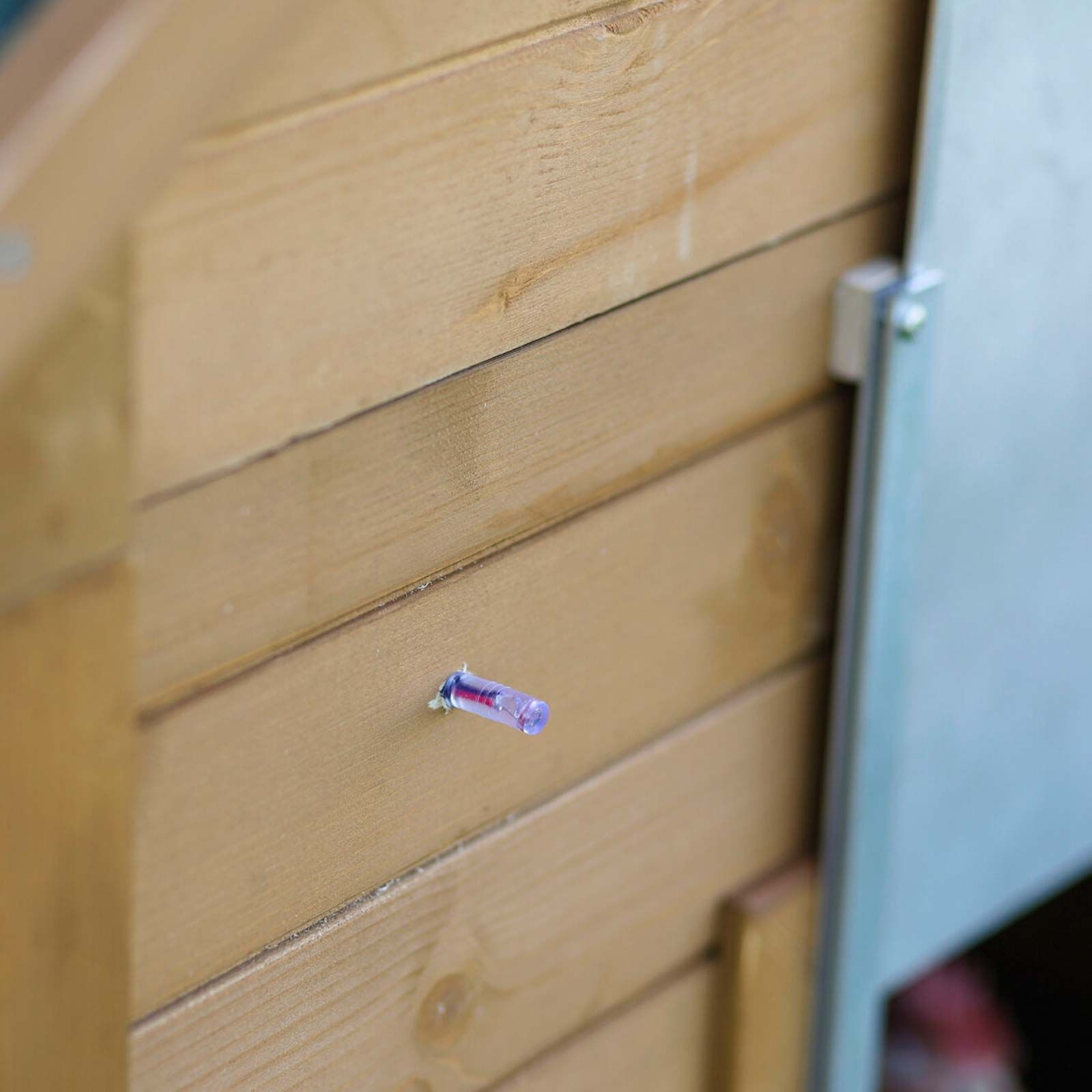 Wenn Sie die automatische Hühnertür mit Netzspannung versorgen wollen, stellen Sie sicher, dass eine 230 Volt Steckdose in der Nähe zur Verfügung steht. Das Netzteil und der Montageort des Geräts muss vor Regenfall geschützt sein. Die automatische Hühnertür ist nicht mit Schieber bzw. Klappen kompatibel, die eine Selbstverriegelung besitzen.