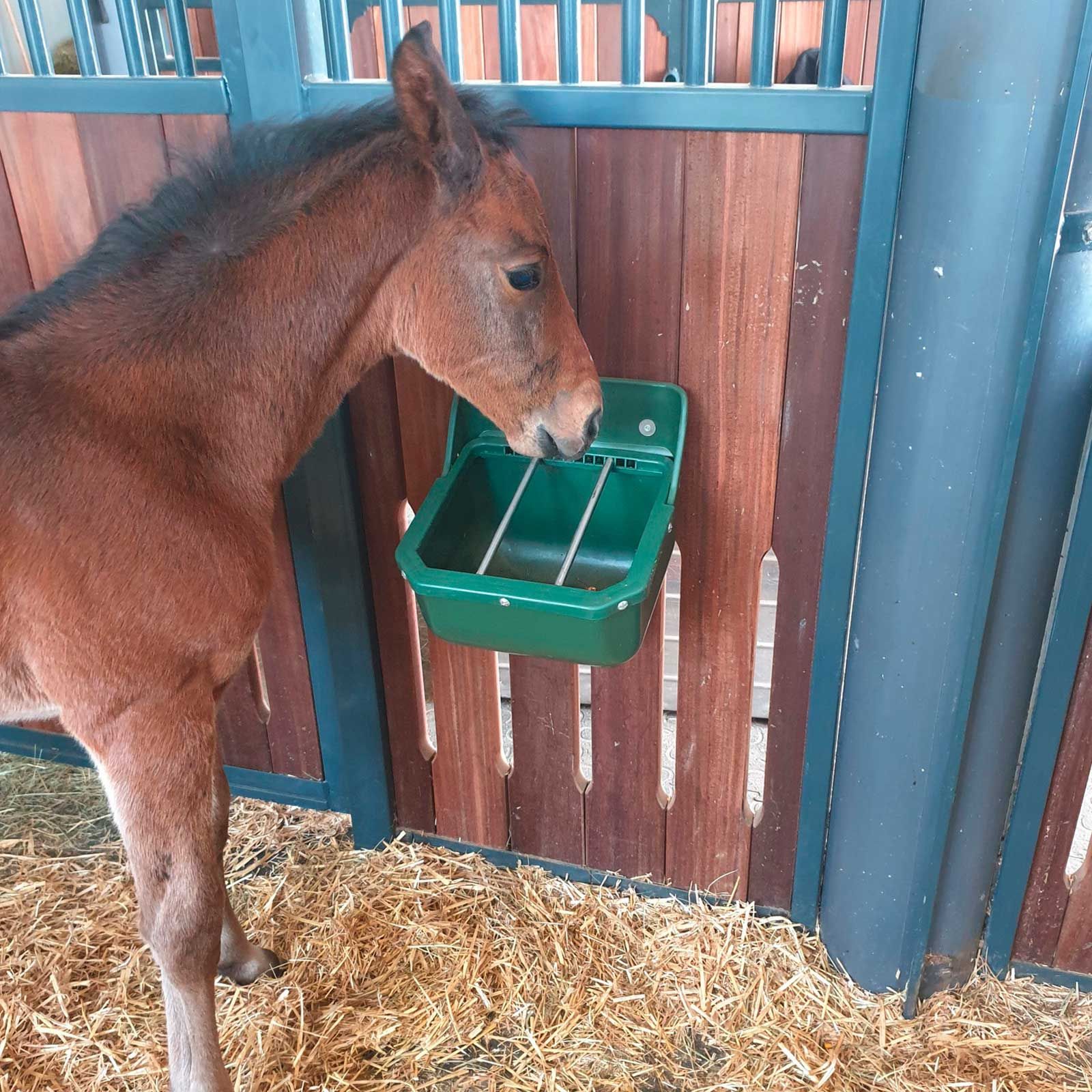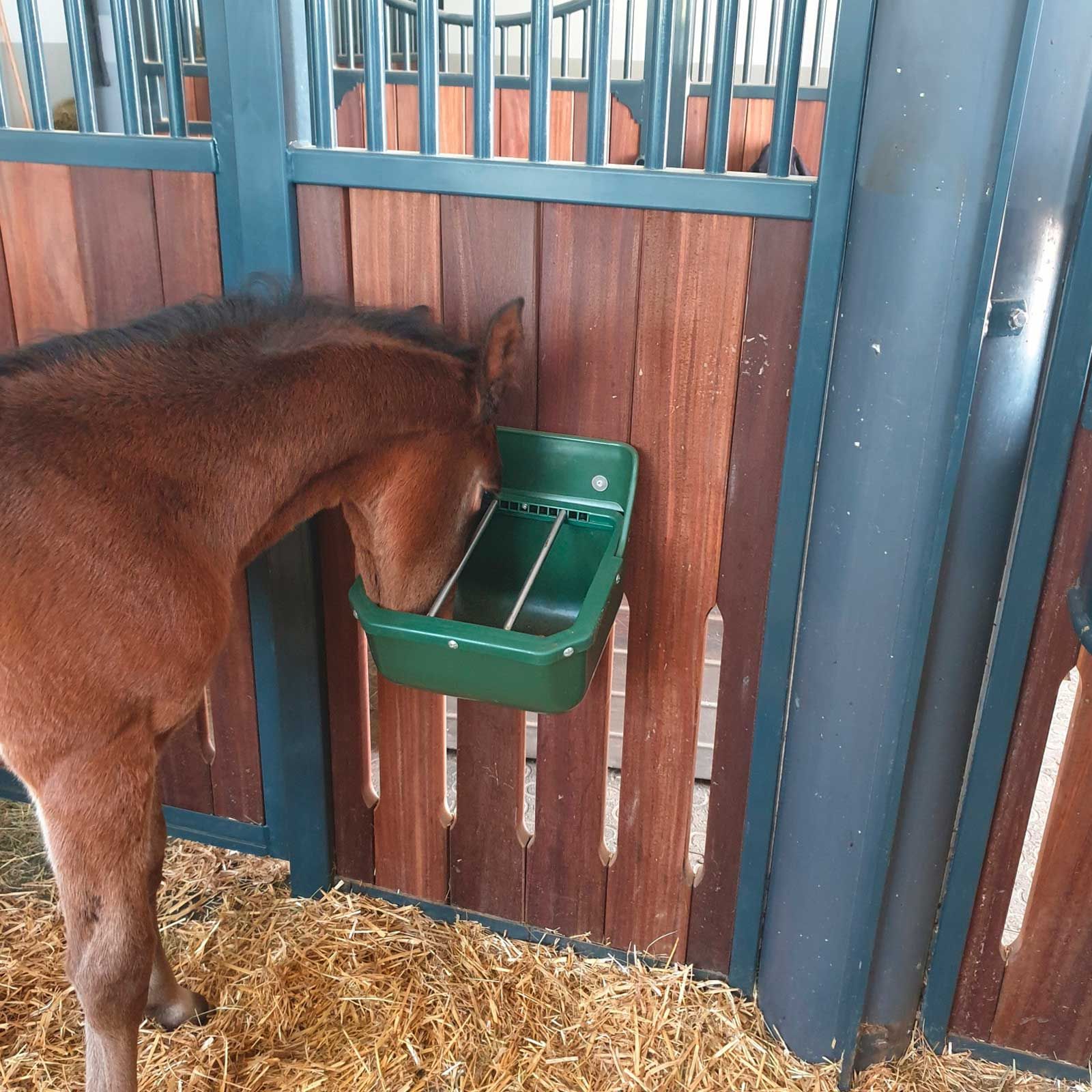 Bei diesem Fohlentrog sind die Metallstäbe mit wenigen Handgriffen herausnehmbar.