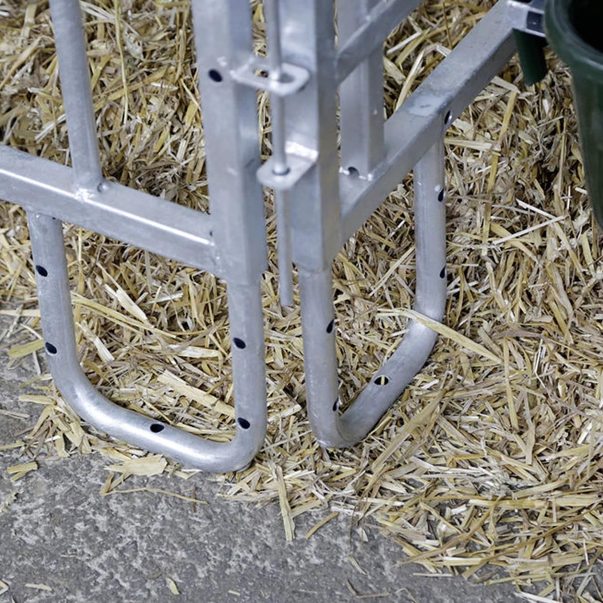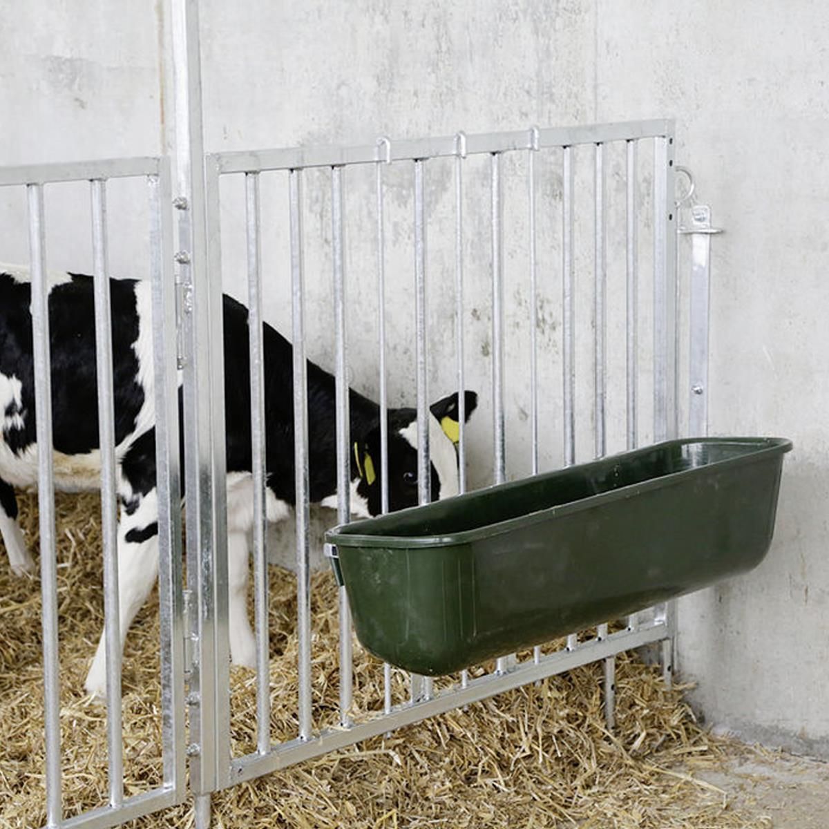 Das Kälberzaunteil bietet eine kostengünstige und tiergerechte Lösung für eine Gruppenhaltung ab 14 Tage bis ca 6 Monate. Fressplätze dienen zur Verhinderung, dass die Tiere sich beim Fressen gegenseitig vom Futter verdrängen.