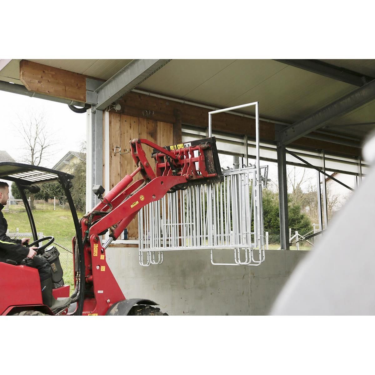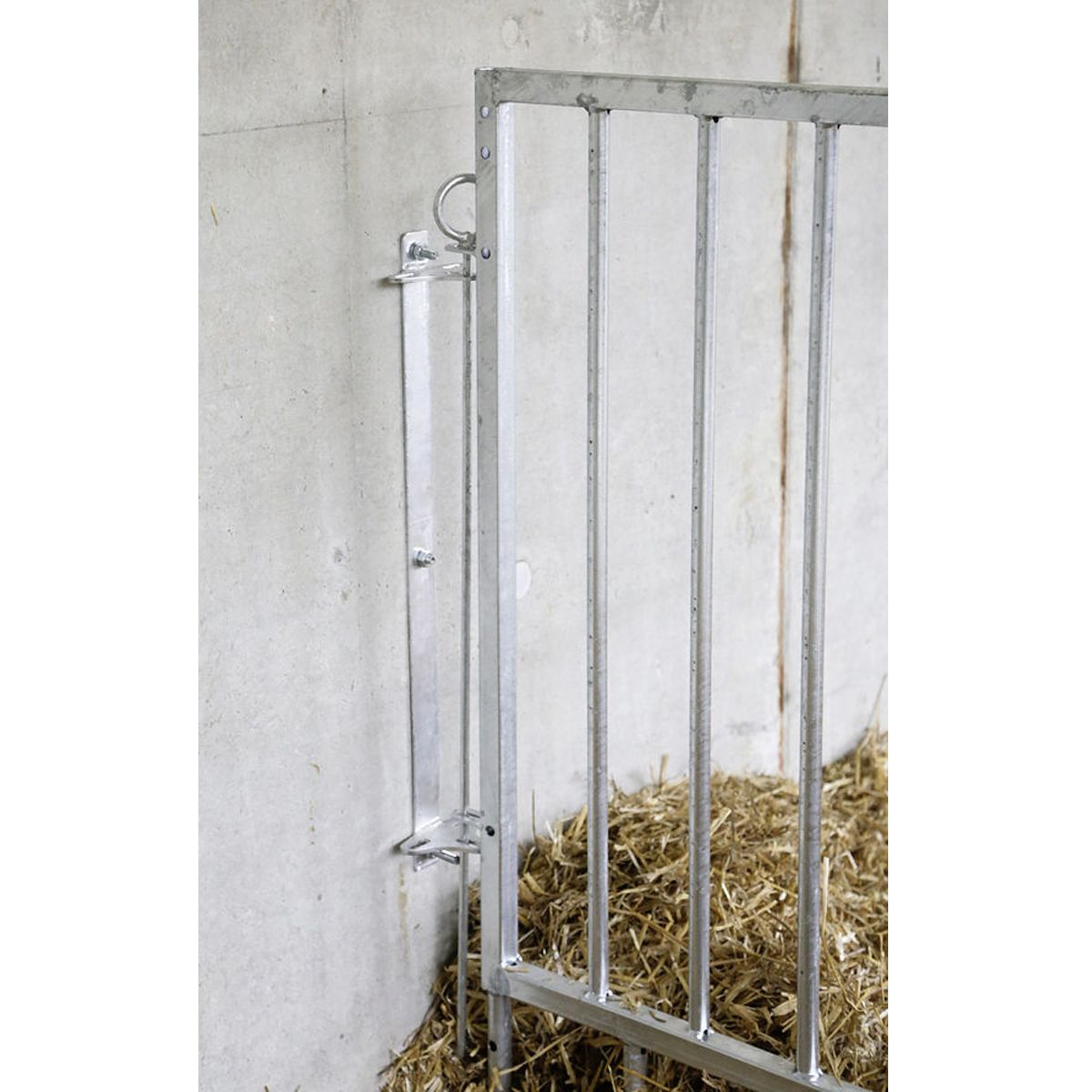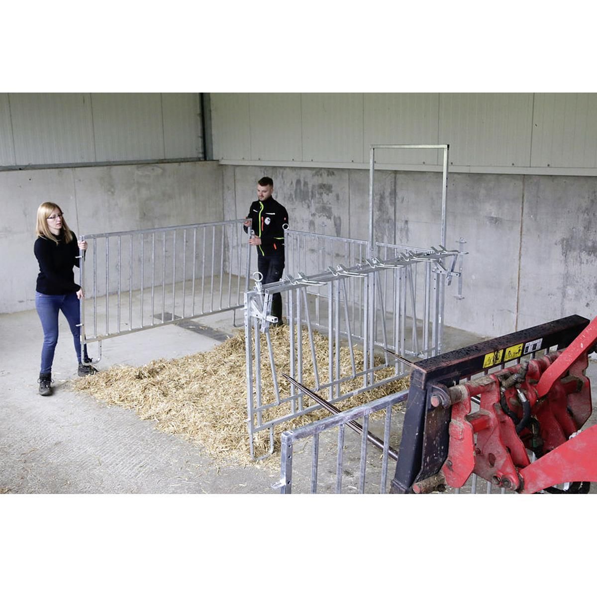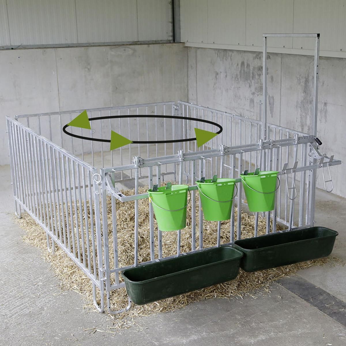 Zur Haltung der Kälber in einer Halle oder überdachtem Bereich, kann die Umzäunung einfach mittels einer Wandhalterung an der Wand befestigt werden. Oder die Umzäunung wird am Boden verankert. Individuell kann die Umzäunung je nach Anforderungen zusammengestellt werden.