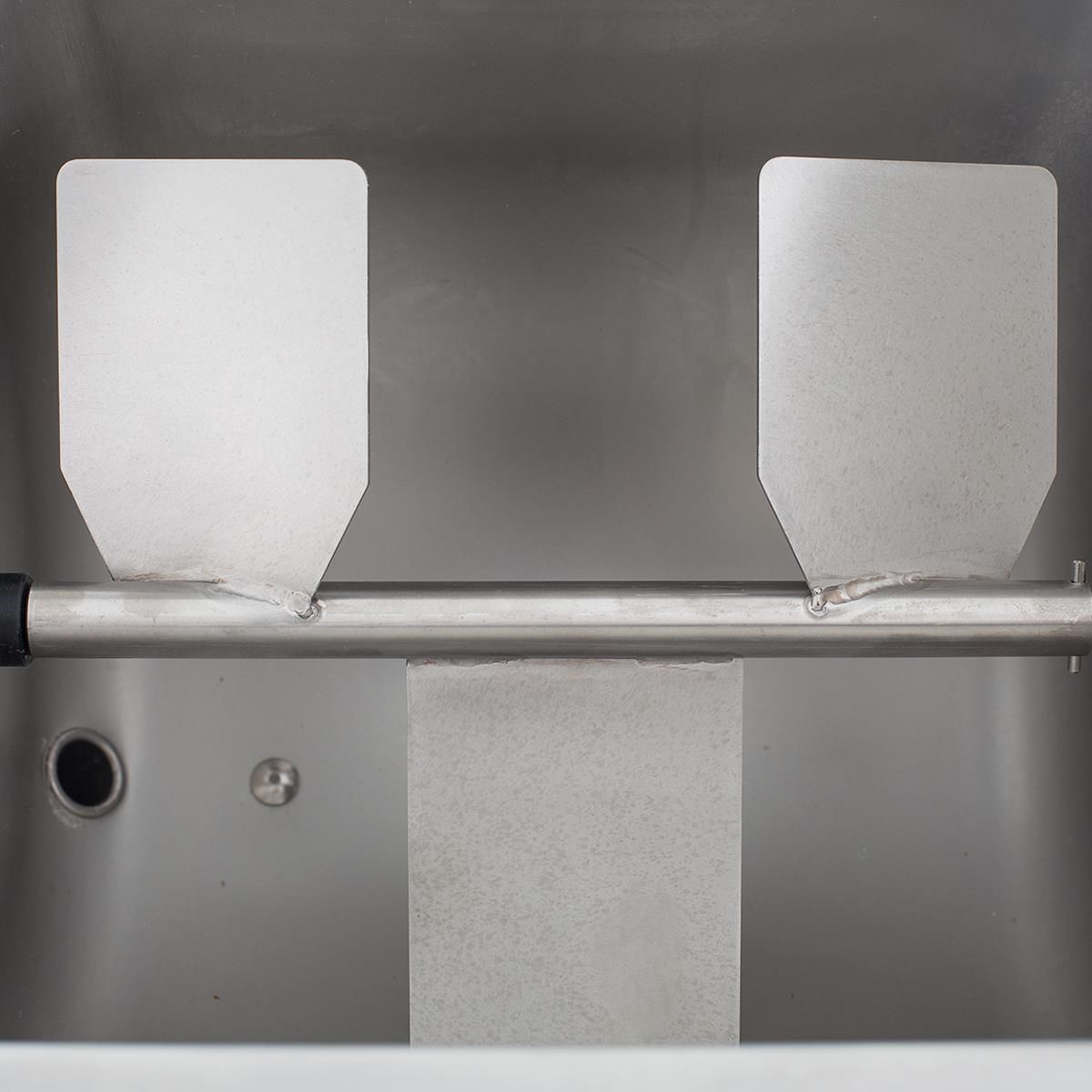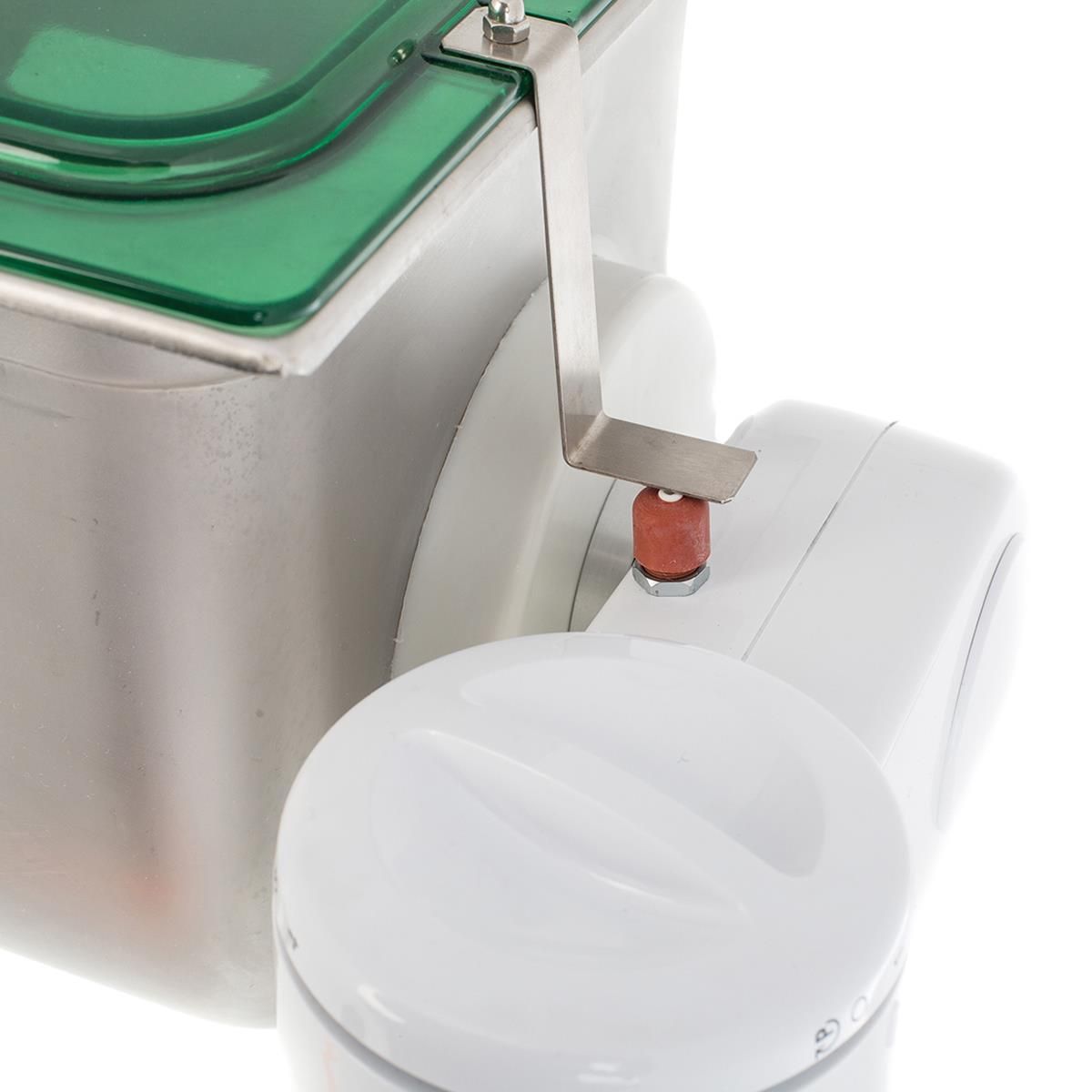 Der einzigartige, große Sichtdeckel ermöglicht Ihnen den Produktionsvorgang ständig unter Beobachtung zu halten. Ein automatischer Sicherheits-Stop beim Öffnen des Sichtdeckels während des Betriebs verhindert Unfälle. Der mehrstufige 550 W, 230 V Motor erlaubt kürzere oder längere Butterungszeiten zwischen 20 und 35 Minuten. Mit dem separaten Ablasshahn wird die Buttermilch auf einfache Weise abgelassen und die Butter gewaschen. Alle Teile, die mit Rahm in Berührung kommen, sind aus langlebigem Edelstahl gefertigt und daher extrem pflegefreundlich und haltbar.