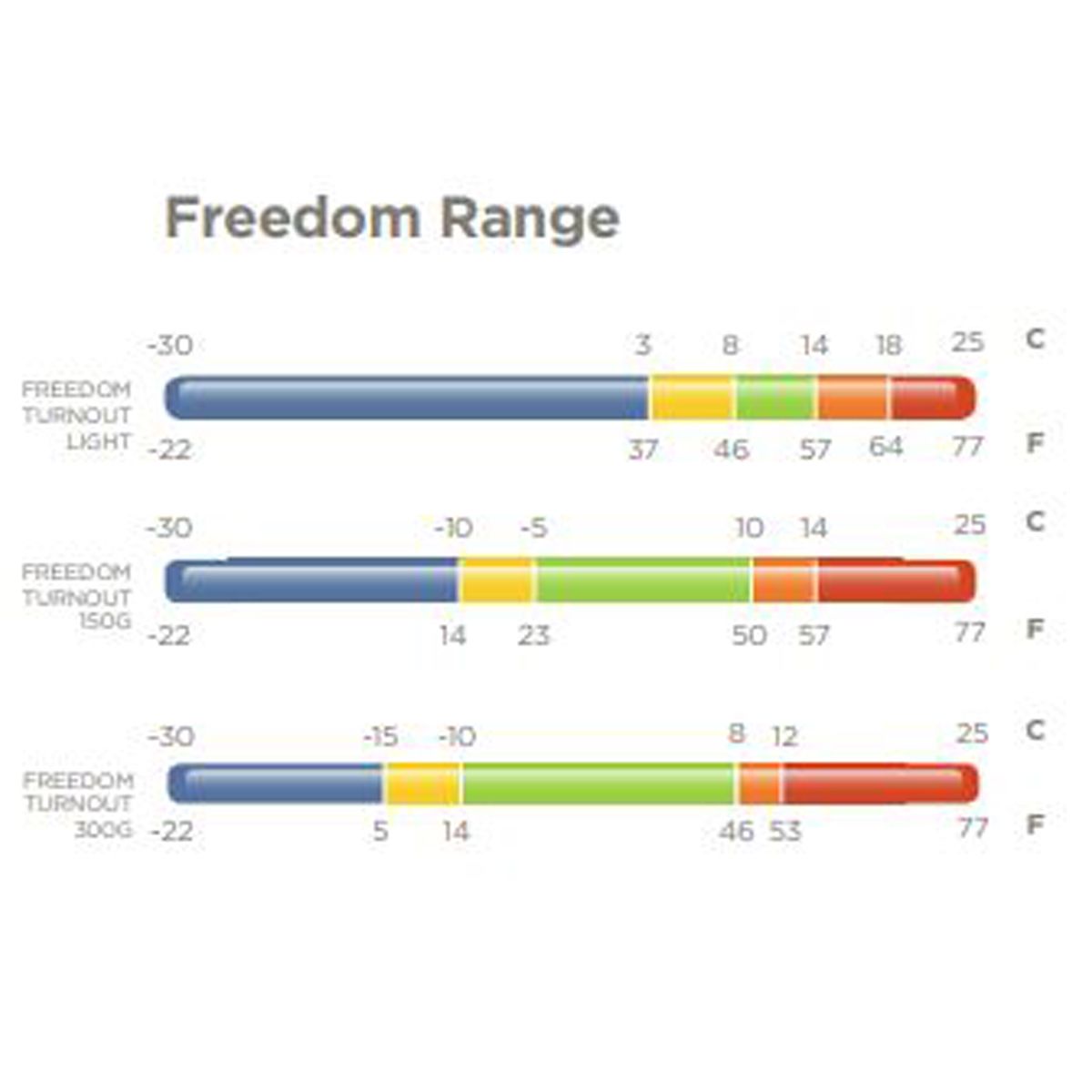 Die Temperaturbereiche der Bucas Freedom Turnout Light Pferdedecke liegen zwischen + 8 °C und 14 °C. Jedoch ist dieser Bereich von vielen Faktoren wie Sonne, Feuchtigkeit, Wind, Pferdeaktivität, geschoren und ungeschoren abhängig.