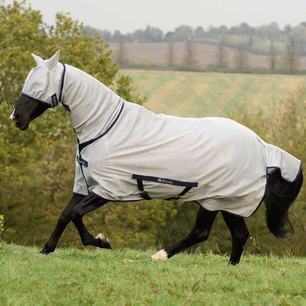 Ein überlappender Front-Verschluss, Beingurte, eine Schweifkordel und ein Schweifschutz gewährleisten zudem einen optimalen Sitz der Decke. Zusätzlich hat die Bucas Freedom Fliegendecke das weiche Bucas “Silk-feel”-Innenfutter im Mähnenbereich, wodurch Scheuerstellen vermieden werden.