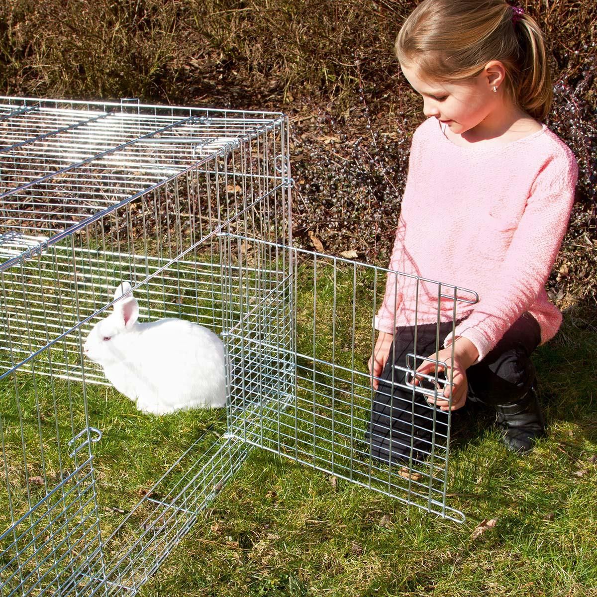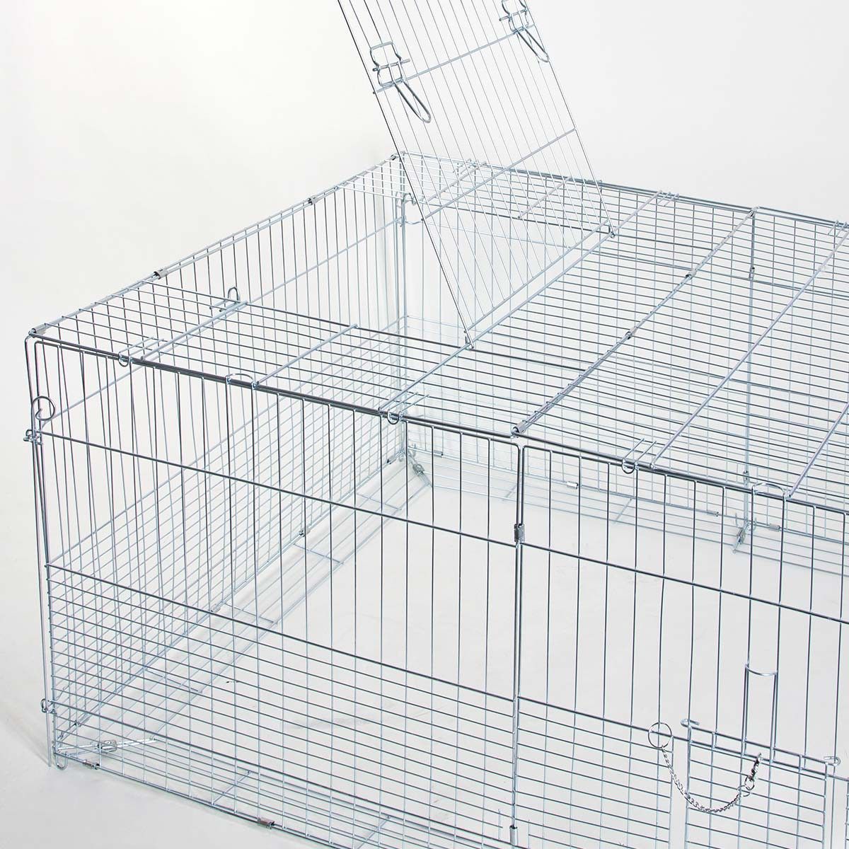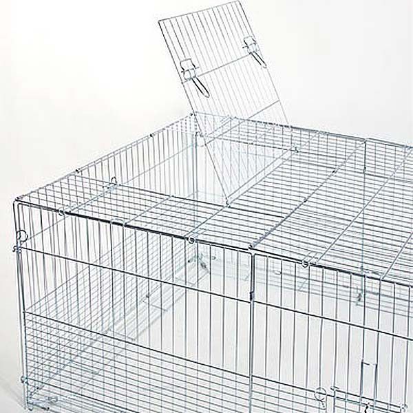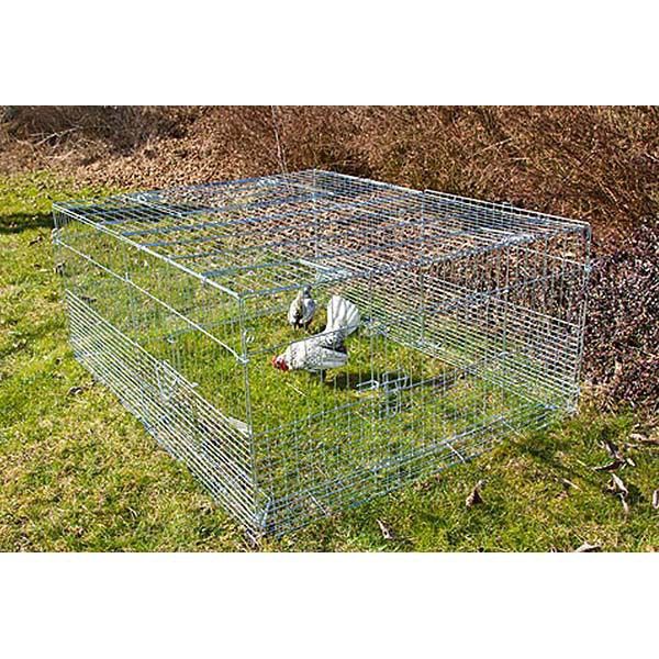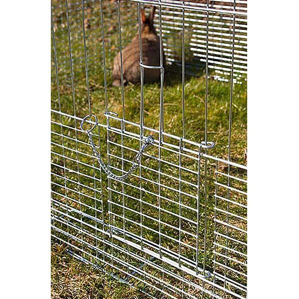 Bei diesem universell einsetzbaren Freilaufgehege verhindert die Gitterabdeckung das Hinausspringen und bietet optimalen Schutz vor ungebetenen Gästen, wie z. B. Greifvögel, Katzen oder Marder. Der engmaschige Bereich im unteren verhindert ein ungewolltes herausschlüpfen von kleineren Tieren.