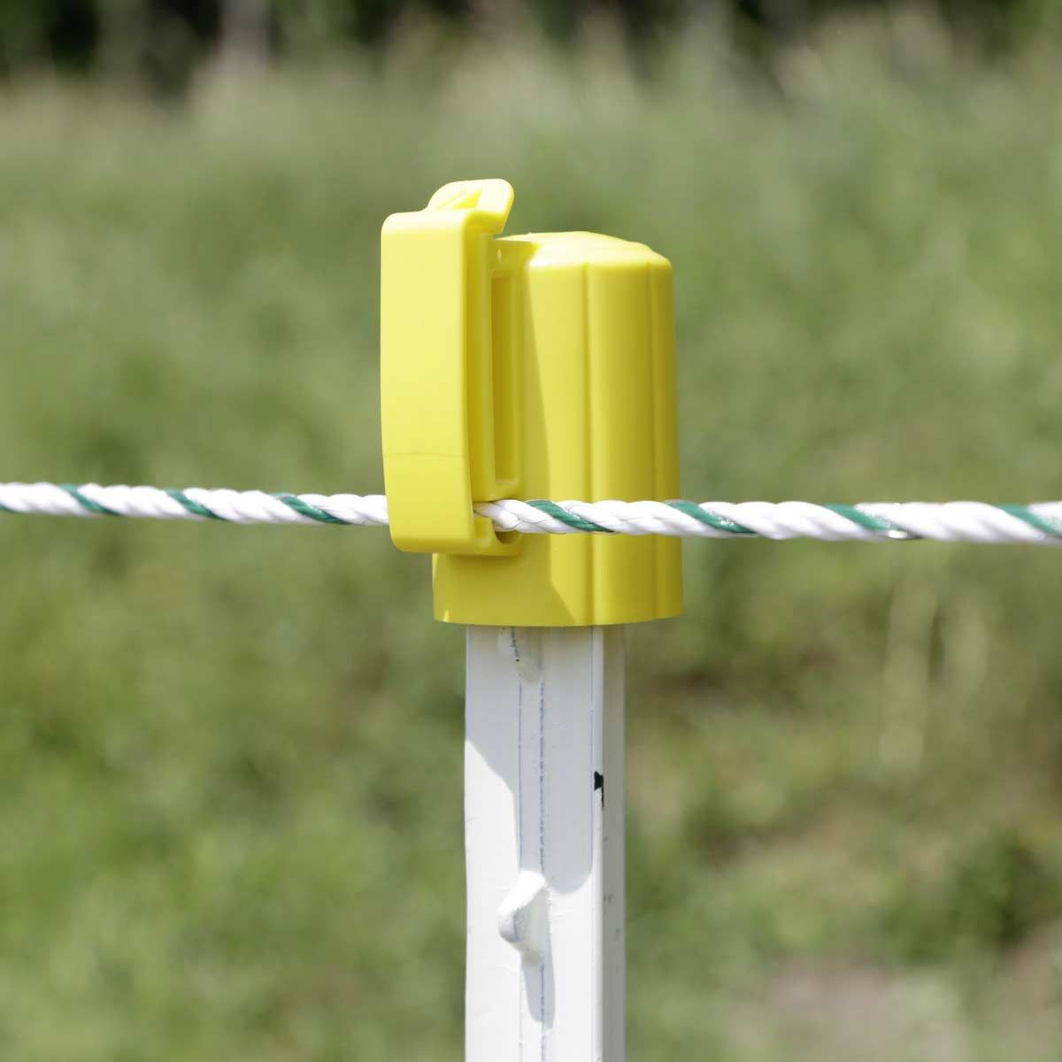 Der Premium Kopfisolator sitzt durch das verbesserte Design mit Pfahlaufnahme noch sicherer auf dem T Pfosten. Er ist aus einem schlagfesten, UV stabilen Kunststoff gefertigt und so langlebig & stabil. Die Anbringung auf einem T-Pfahl ist sehr einfach: Den Isolator auf die Pfostenoberseite draufsetzen, Leitermaterial hindurchführen, Clip schließen - fertig! Der T-Post Isolator ist in klassischem Schwarz oder in der besser sichtbaren Signalfarbe Gelb verfügbar. Durch die gelbe Signalfarbe hat der Kopfisolator zusätzlich eine abschreckende Wirkung.