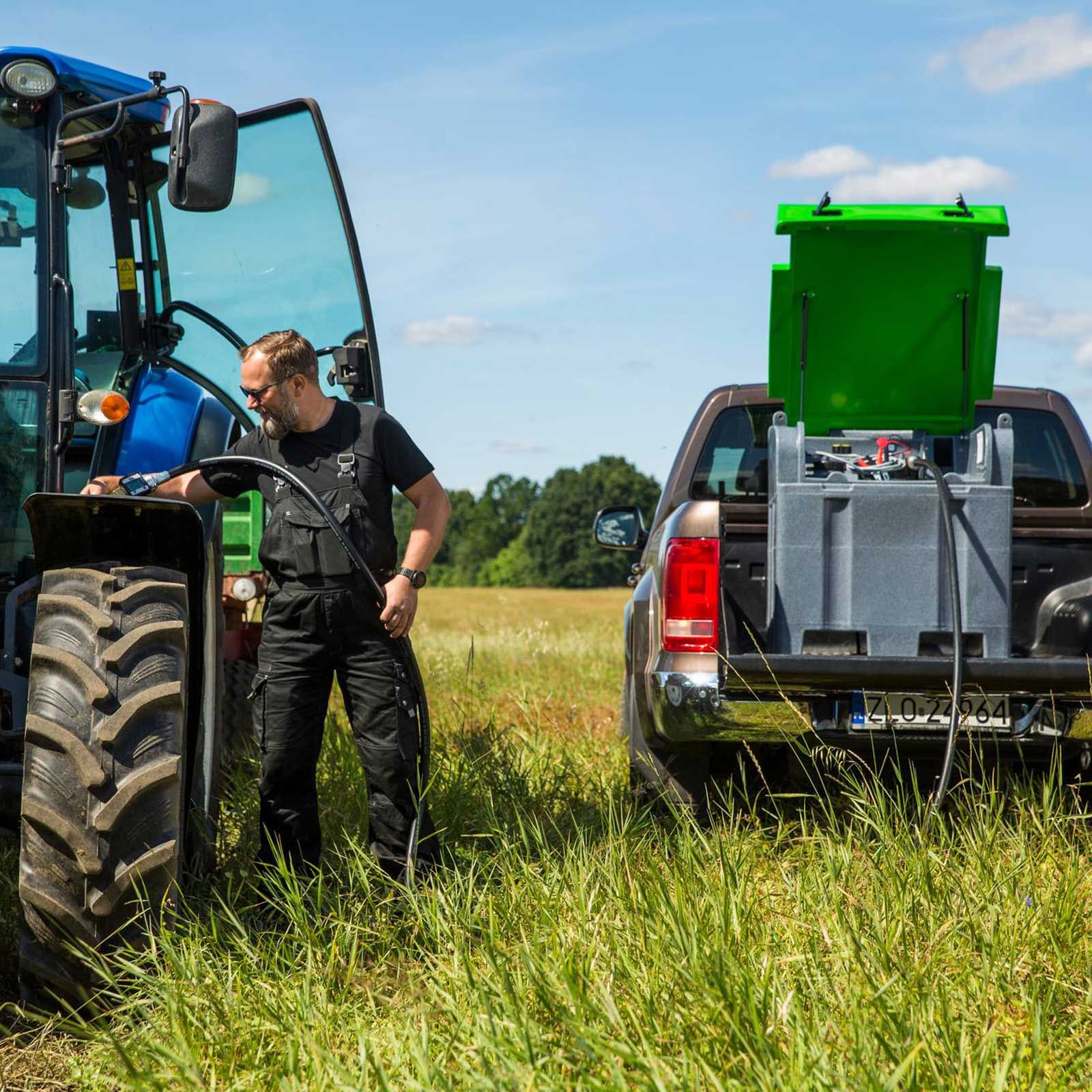 Ideal als mobile Tankstelle für Outdooreinsätze wie Wald-, Forst-, Bau- und anderen Arbeitseinsätzen, ohne dafür zu einer Tankstelle fahren zu müssen. Nutzfahrzeuge und anderen Arbeitsmaschinen ganz einfach überall betanken.