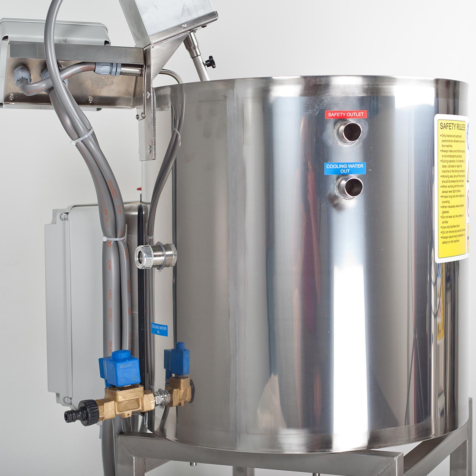 Der Kessel erhitzt sich so lange, bis die Temperaturkontrolle die gewünschte Temperatur erreicht, diese wird dann bis zum Ende der Zykluszeit gehalten. Beendet wird der Prozess selbstständig mit einer automatischen Abschaltung. Durch die automatische Kühlung durch Wasseraustausch wird das Medium auf die gewünschte Temperatur gekühlt und der bereits vorprogrammierte nächste Schritt der Verarbeitung wird automatisch gestartet. Das Rührwerk für den Mixer arbeitet mit ca. 104 Upm und kann jederzeit ein- oder ausgeschalten werden. Am Ende des Produktionsprozesses wird das flüssige Produkt über den großen DN 50 Auslass abgelassen.