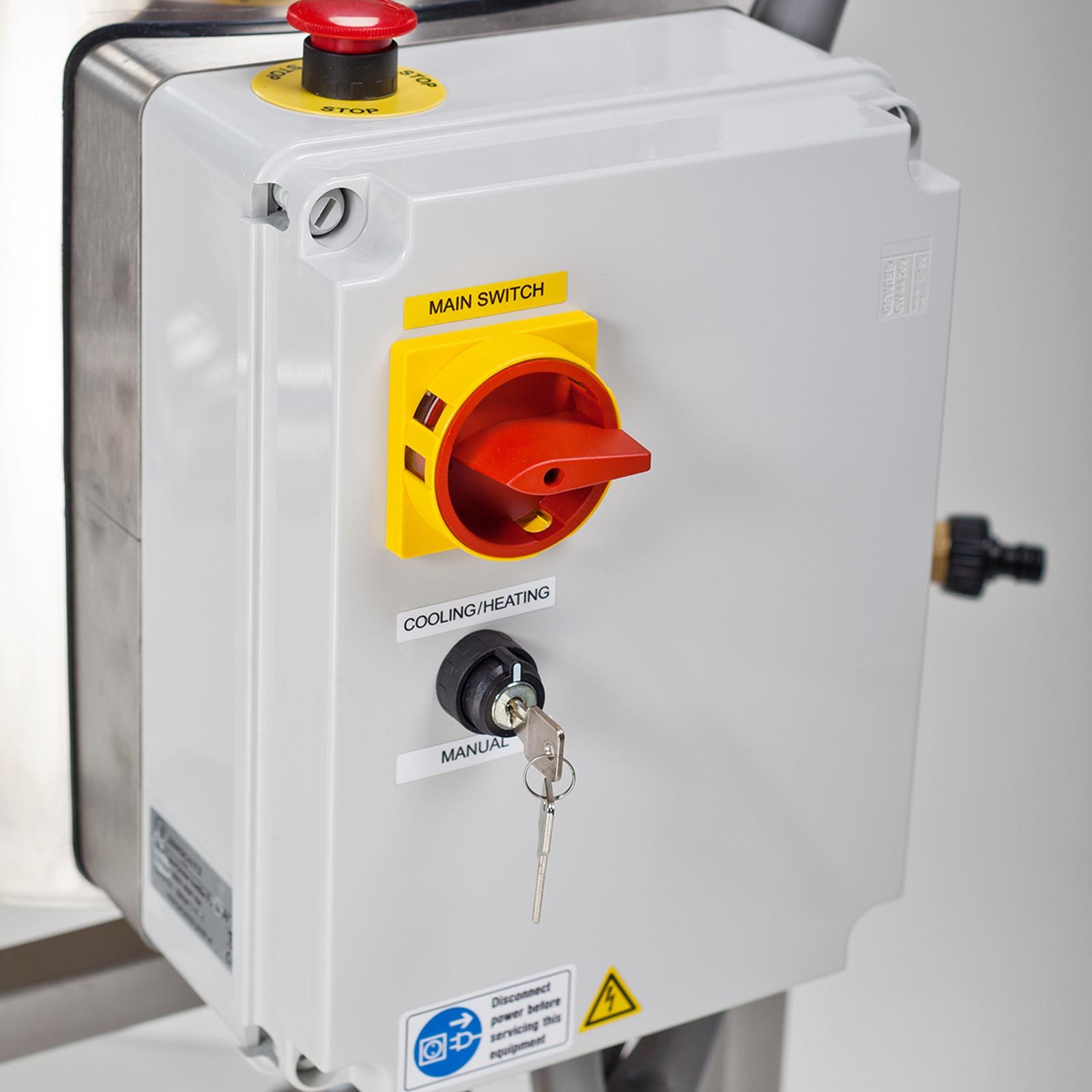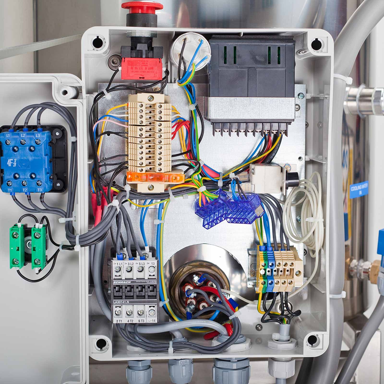 Mit der elektronischen Steuerung können Sie bis zu 4 verschiedene Programme auswählen. Die Temperatureinstellung gibt die Möglichkeit bis zu 4 Temperaturen von 5 °C bis 94 °C einzustellen, bis zu 4 Zykluszeiten können auf 999 Minuten programmiert werden. Es besteht auch die Möglichkeit mehrere, hintereinander folgende Produktionsprozesse vorzuprogrammieren und zu automatisieren, somit ist keine Anwesenheit erforderlich. Ein manueller Eingriff ist trotzdem jederzeit möglich.