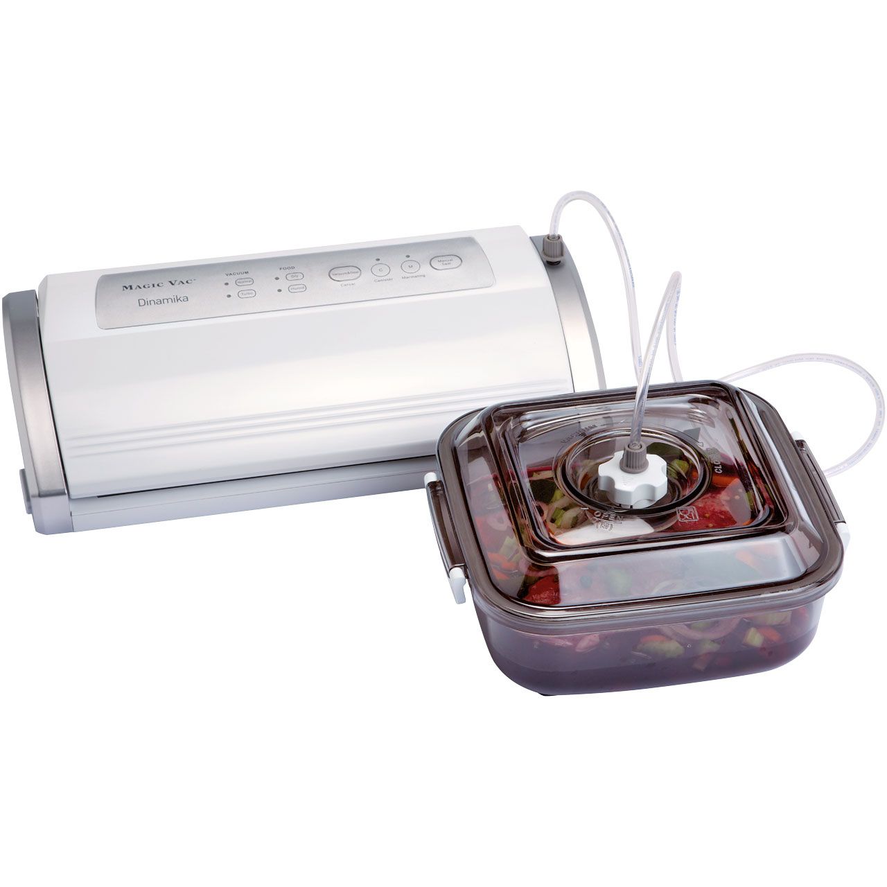 Mit dem Magic Vac Dinamika Vakuumiergerät ist das Vakuumieren von Fleisch, Fisch und anderen Lebensmitteln leicht gemacht. Durch das das Entziehen der Luft aus dem Beutel wird das frische Produkt luftdicht verschlossen, dadurch wird der Zersetzungsprozess verlangsamt und das Produkt um das Drei- bis Fünffache länger haltbar.